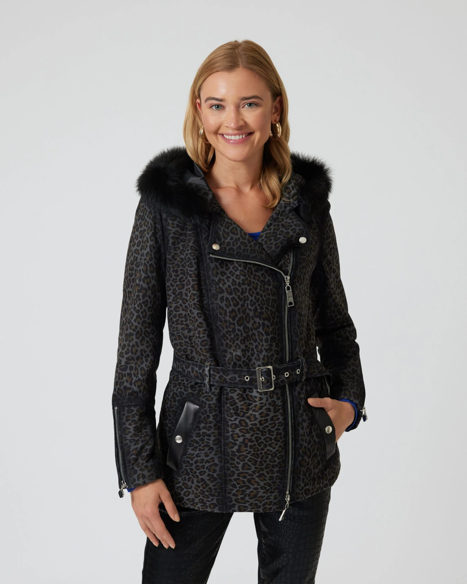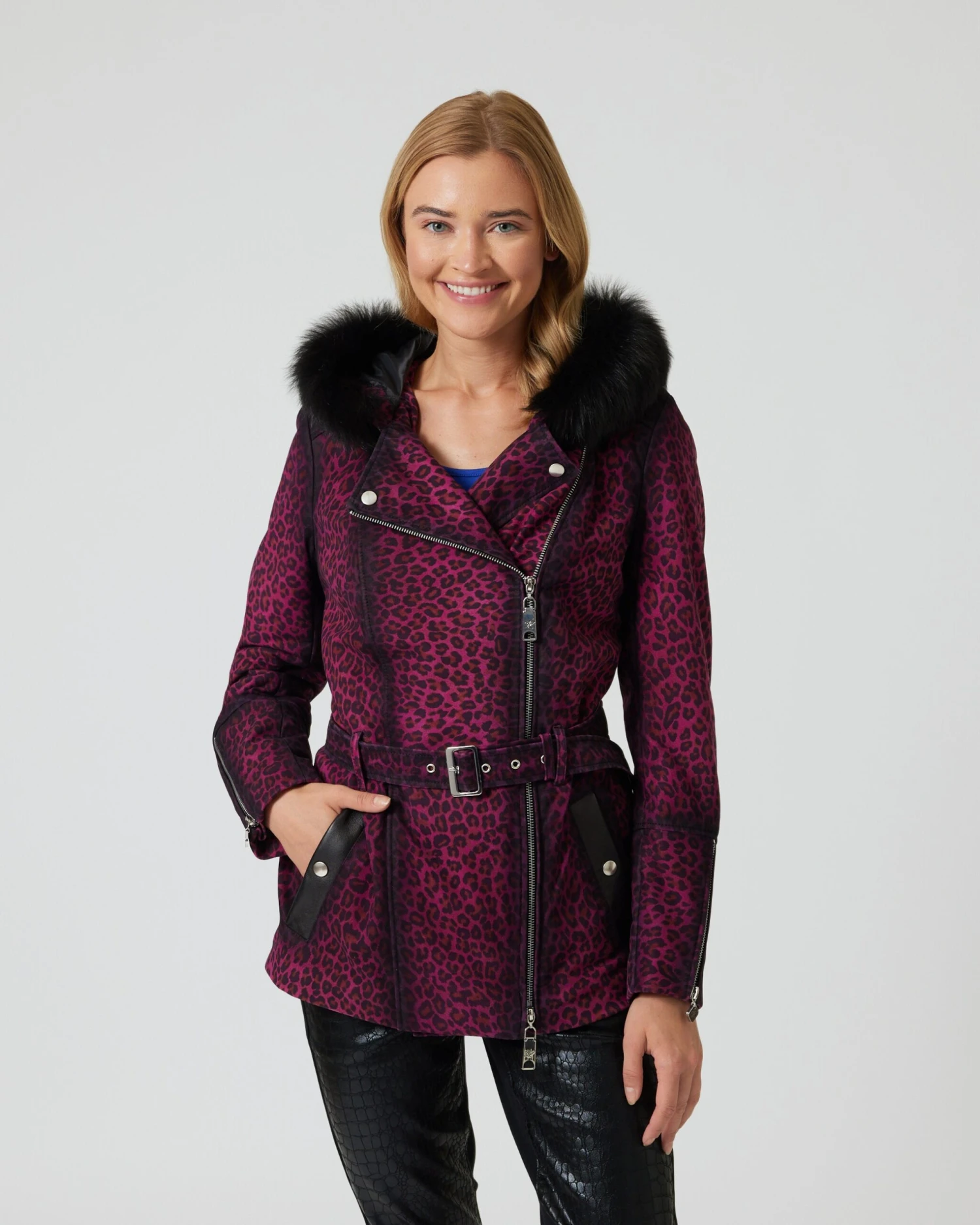 Diese edle Lederjacke ist im sportiven Biker-Stil gehalten: Dafür stehen der asymmetrische Reißverschluss, die Reißverschluss-Ärmel und der lässige Taillengürtel. Aber auch die feminine Seite kommt nicht zu kurz: Neben dem stylischen Allover-Leo-Design begeistert die Jacke auch durch ihren großen, abnehmbaren Kuschelkragen aus Lammfell. Jederzeit besten Tragekomfort gewährleistet das edle Futter mit Logo-Signatur.