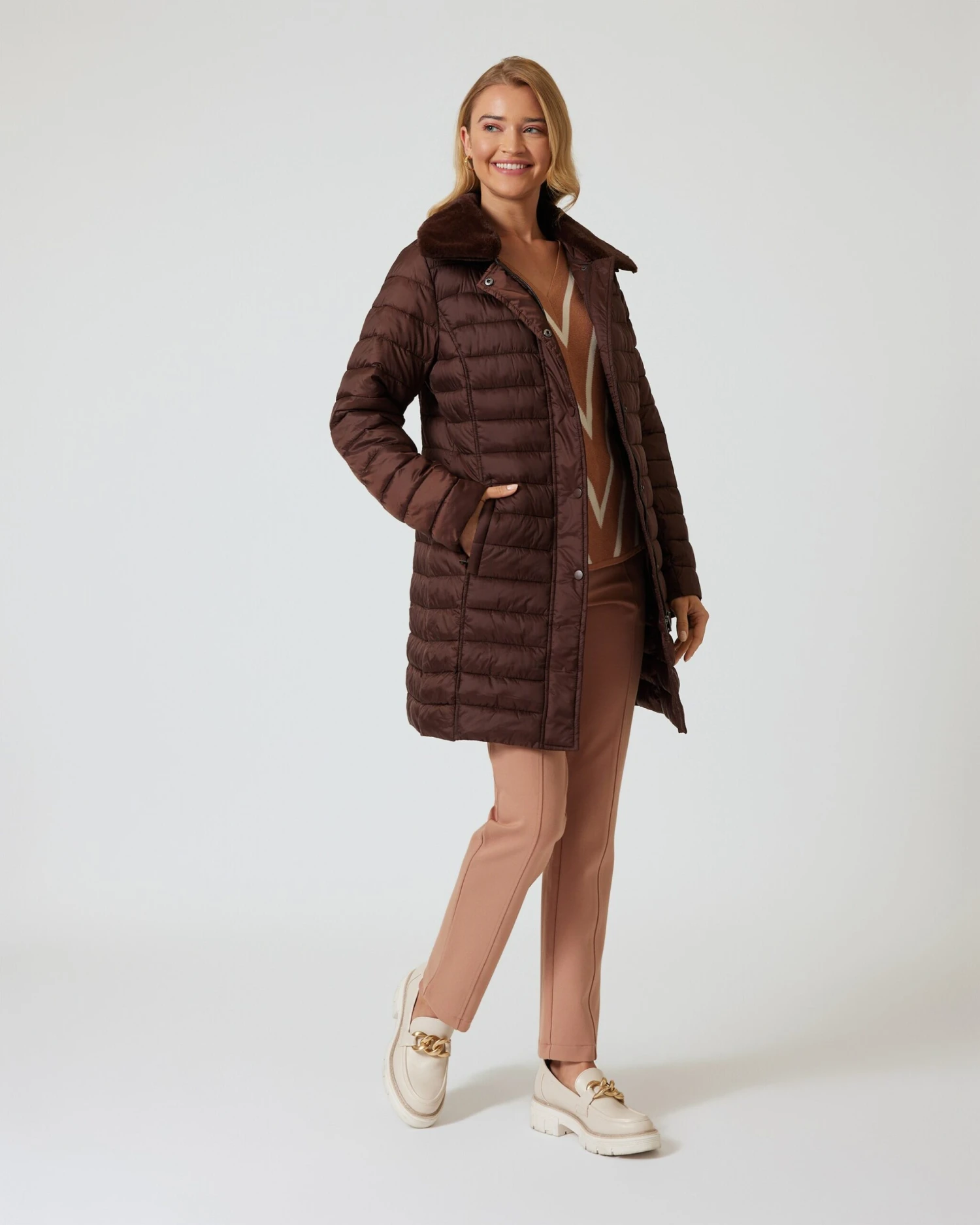 Entdecken Sie unsere modische Damenjacke in angesagter Quer-Steppung. Diese Long-Steppjacke bietet nicht nur einen trendigen Look, sondern auch höchsten Komfort. Das Beste: Die kuschelige Fake Down Füllung hält Sie auch an ungemütlich kalten Tagen schön warm. Der Umschlagkragen mit abnehmbarem Kunstpelzbesatz verleiht der Jacke zudem eine elegante Note. Die Jacke ist mit einer im Kragen integrierten Kapuze ausgestattet, die mit einem Gummibandeinzug und Stopper versehen ist. So sind Sie bestens vor Wind und Wetter geschützt. Der verdeckte Reißverschluss mit Druckknopfverschluss sorgt für ein nahtloses Erscheinungsbild und zuverlässigen Schutz vor Wind und Wetter. Freuen Sie sich auf die zeitlose Eleganz dieses Herbst-Winter-Begleiters.