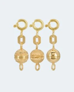 Die praktischen Magnetschließen von Aleksander Sternen machen Schluss mit der mühsamen Fummelei beim Verschließen von Hals- oder Armschmuck. Die Magnetschließe wird ganz einfach an vorhandene Kettenösen oder Verschlüsse wie Karabiner eingehängt. Ist sie einmal integriert, schließt sie durch die große Kraft der Magnete mühelos Kette oder Armband ohne lästiges Herumfummeln. Einfach „anziehend“. In drei Legierungen zur Wahl.