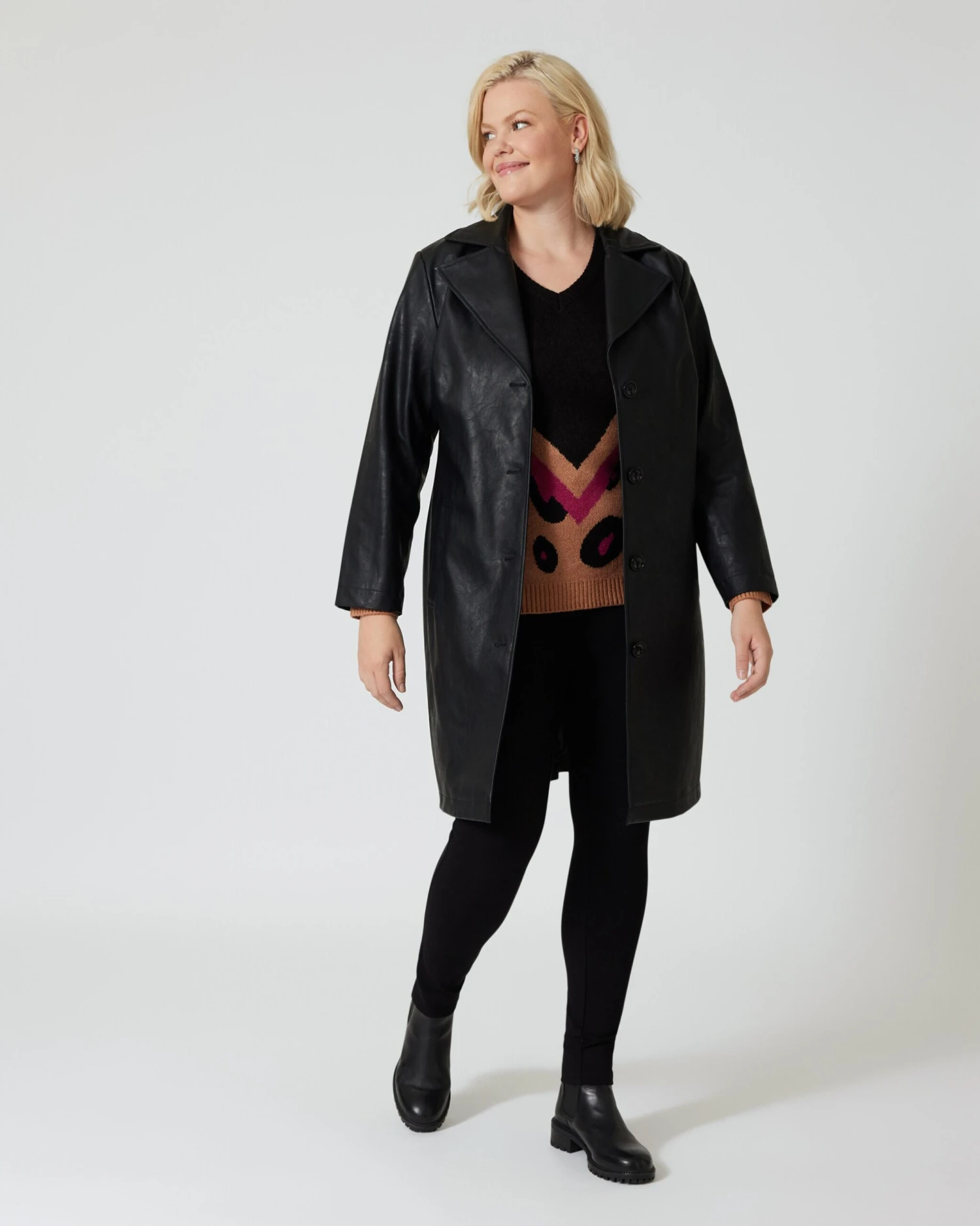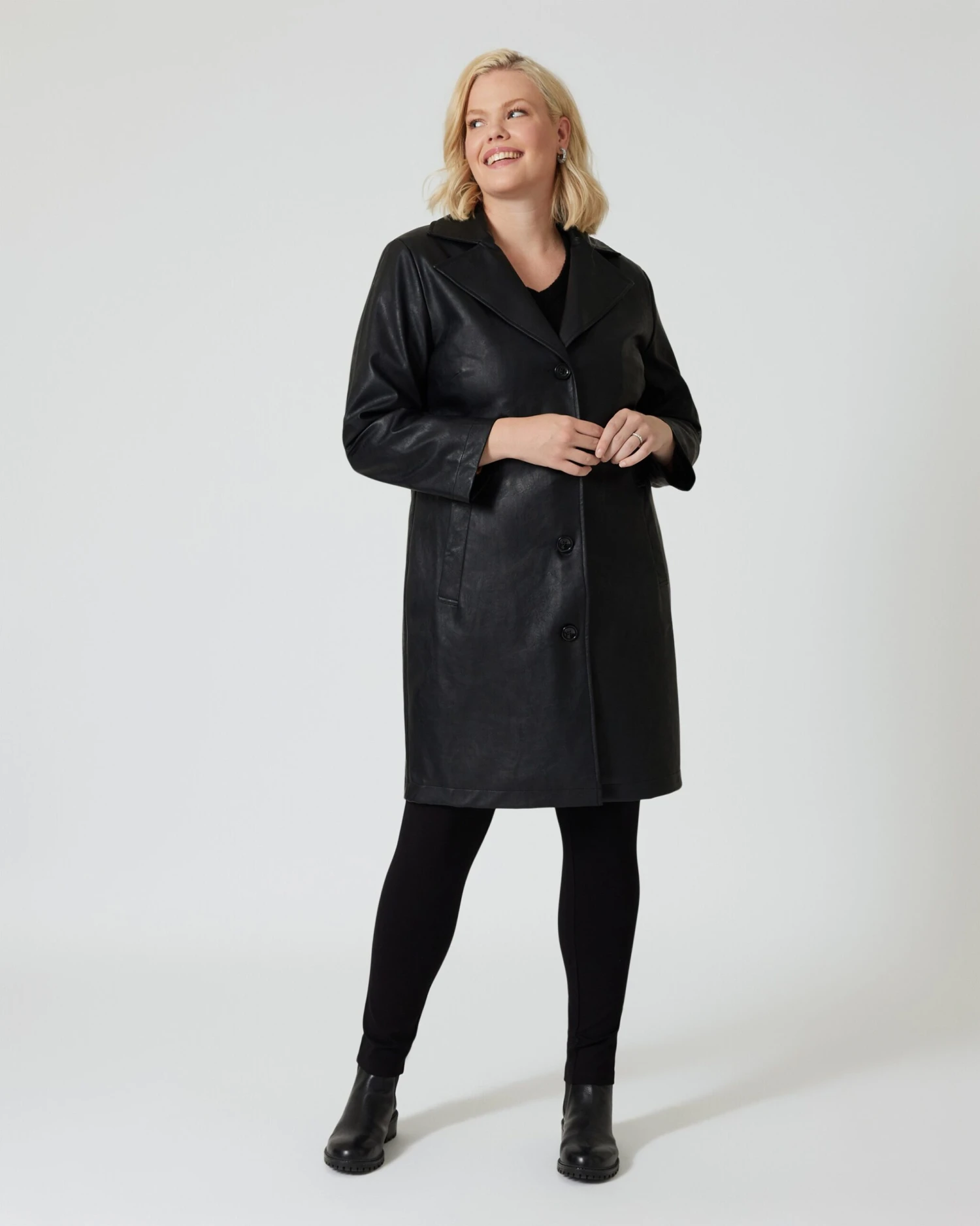 Dieser Mantel in cooler Lederoptik ist ein heißes Teil, das Sie attraktiv in Szene setzt. Der knielange Mantel ist mit einem klassischen Reverskragen designt und wird mit Knöpfen verschlossen. Er ist unifarben und passt zu jeder Art von Style. Ob lässig zu Jeans oder verspielt mit Kleid oder elegant zur Stoffhose – Sie machen eine gute Figur. Außerdem ist er bequem waschbar in der eigenen Maschine.
