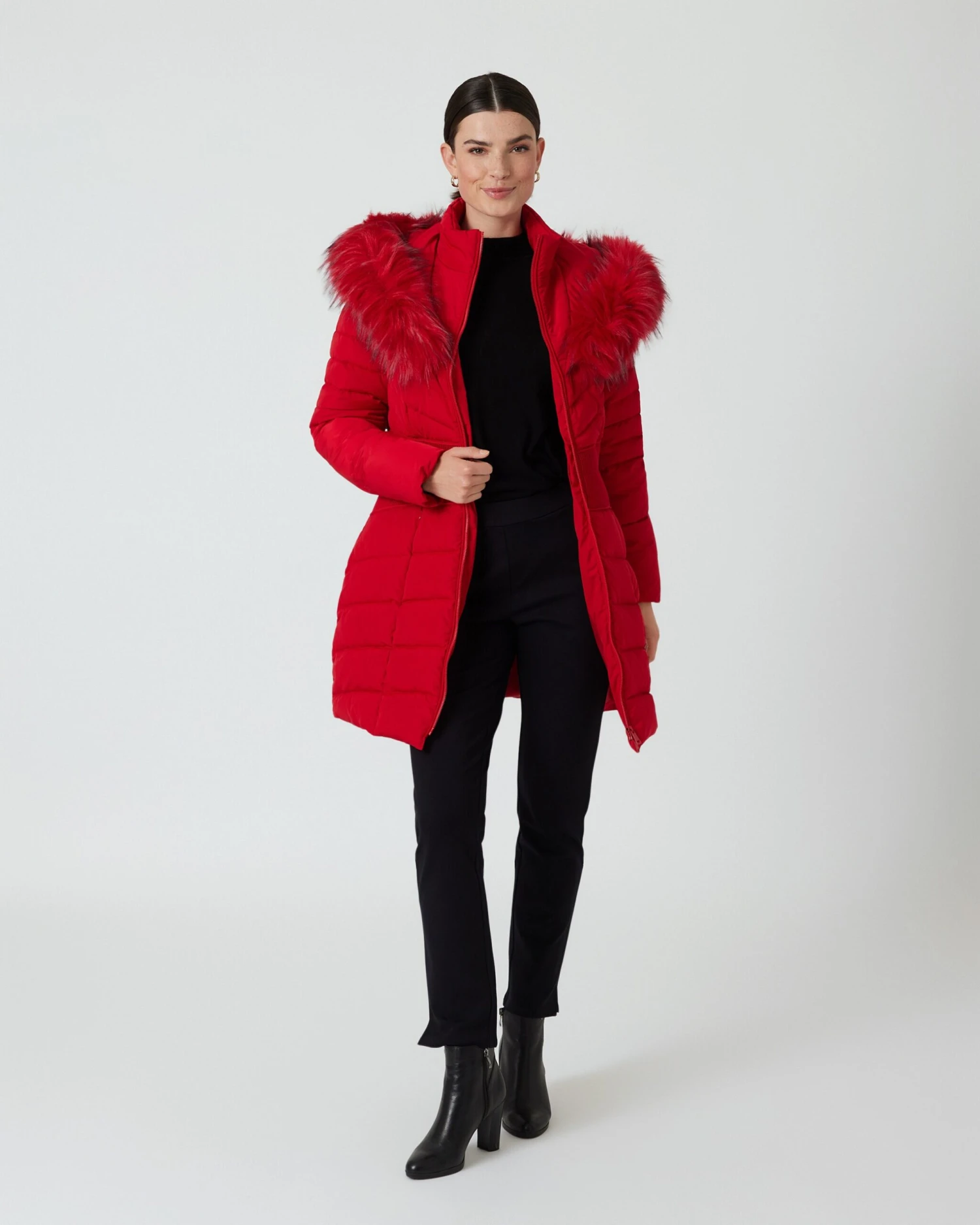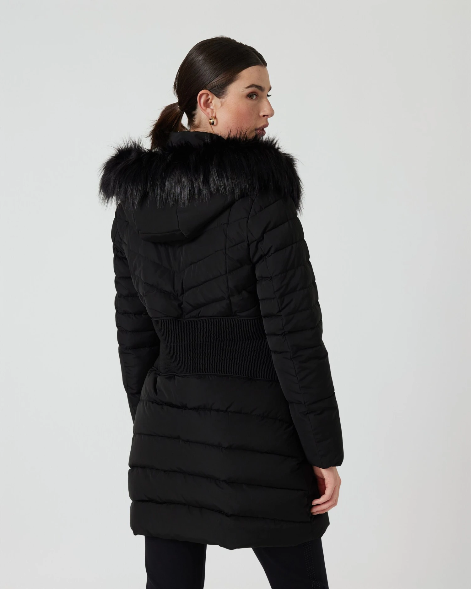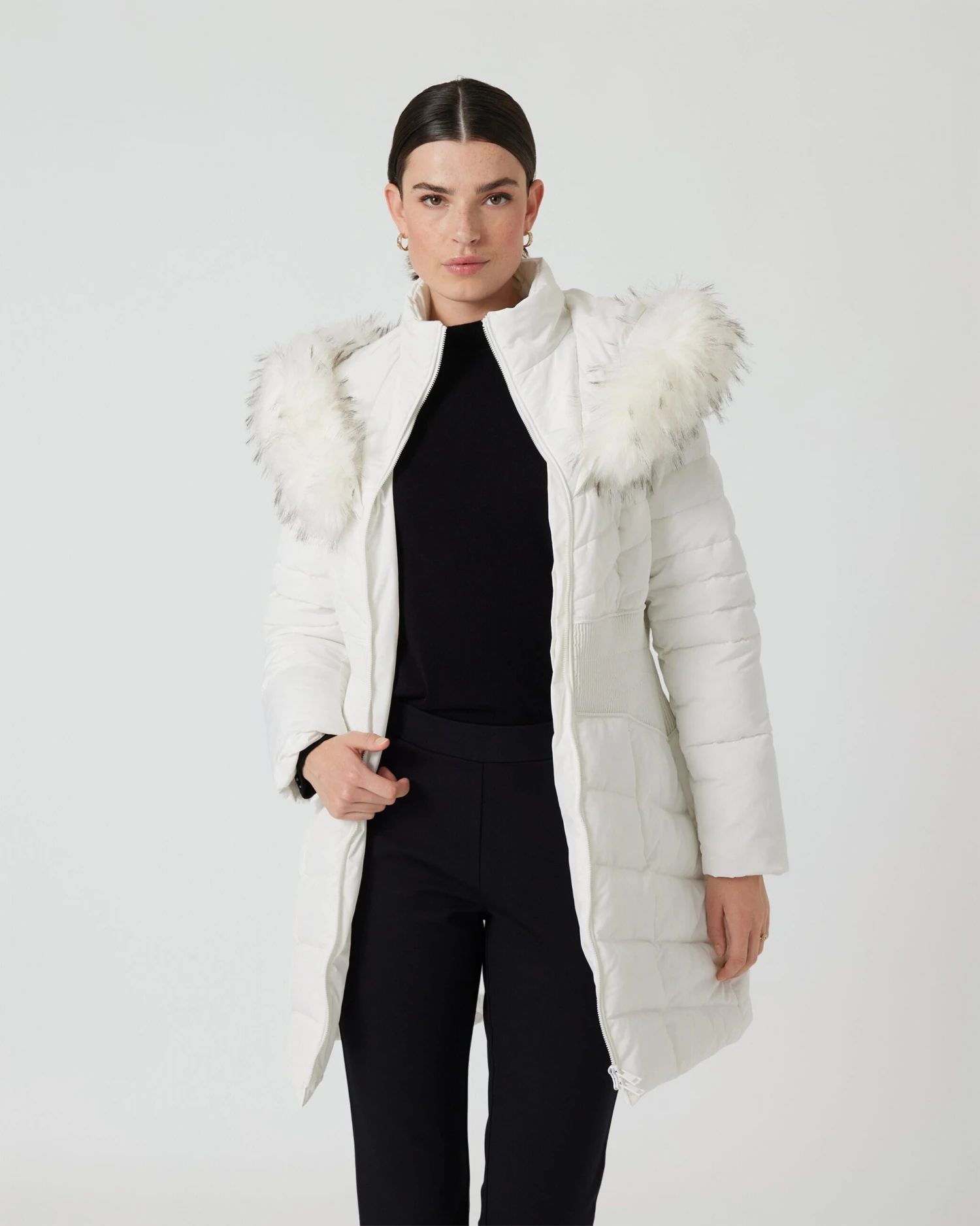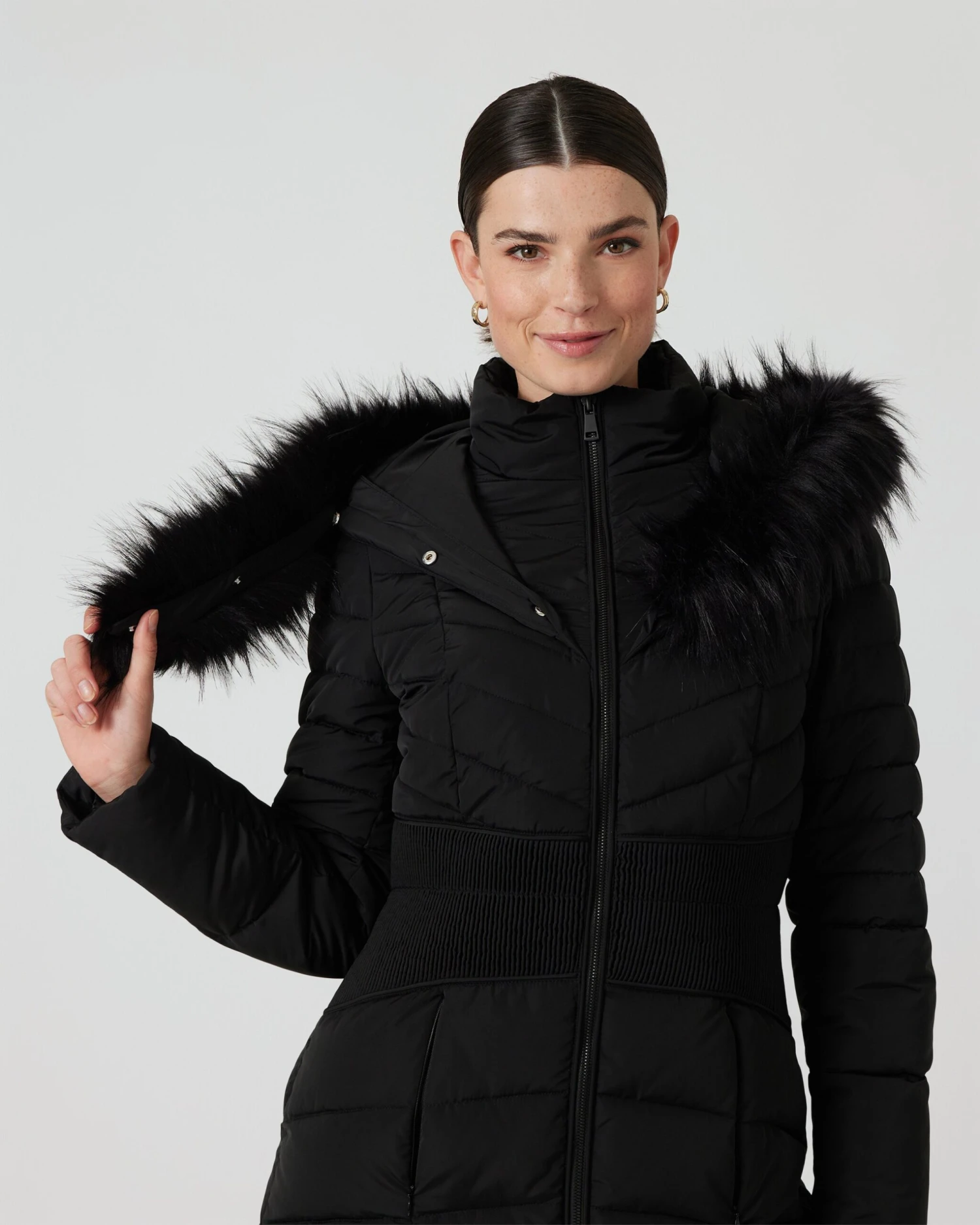 - Stehkragen und Kapuze mit Kunstfell mit langen Grannenhaaren