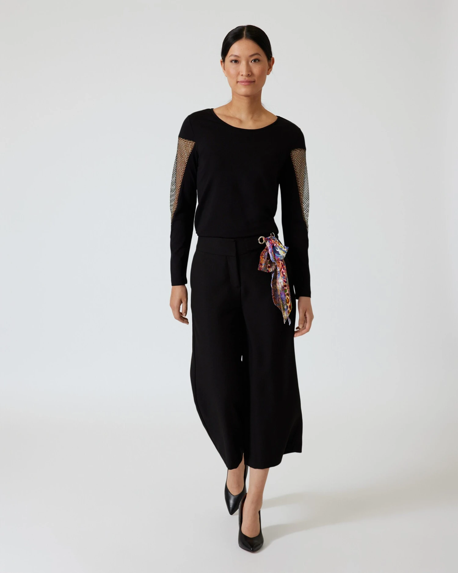 Wie es sich für eine Marlenehose gehört, hat auch diese einen hohen Bund und gerade geschnittene, weite Hosenbeine. Auch auf besten Tragekomfort können Sie sich verlassen, dafür garantiert der bequeme Teildehnbund.