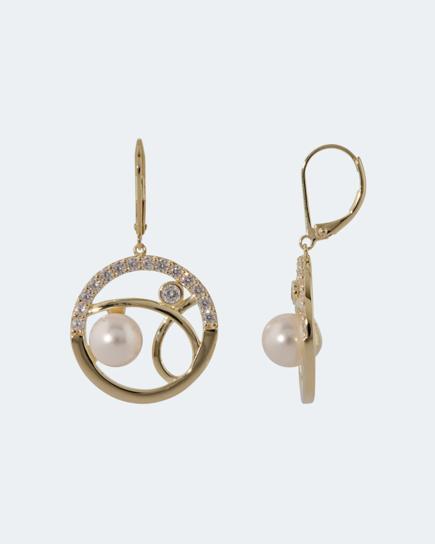 Die Ohrhänger besitzen eine runde Form, die dicht an dicht mit Zirkonia besetzt ist. In der Mitte ist ein schwungvolles Element zu sehen, das von je einer Muschelkernperle und einem großen Zirkonia begleitet wird.