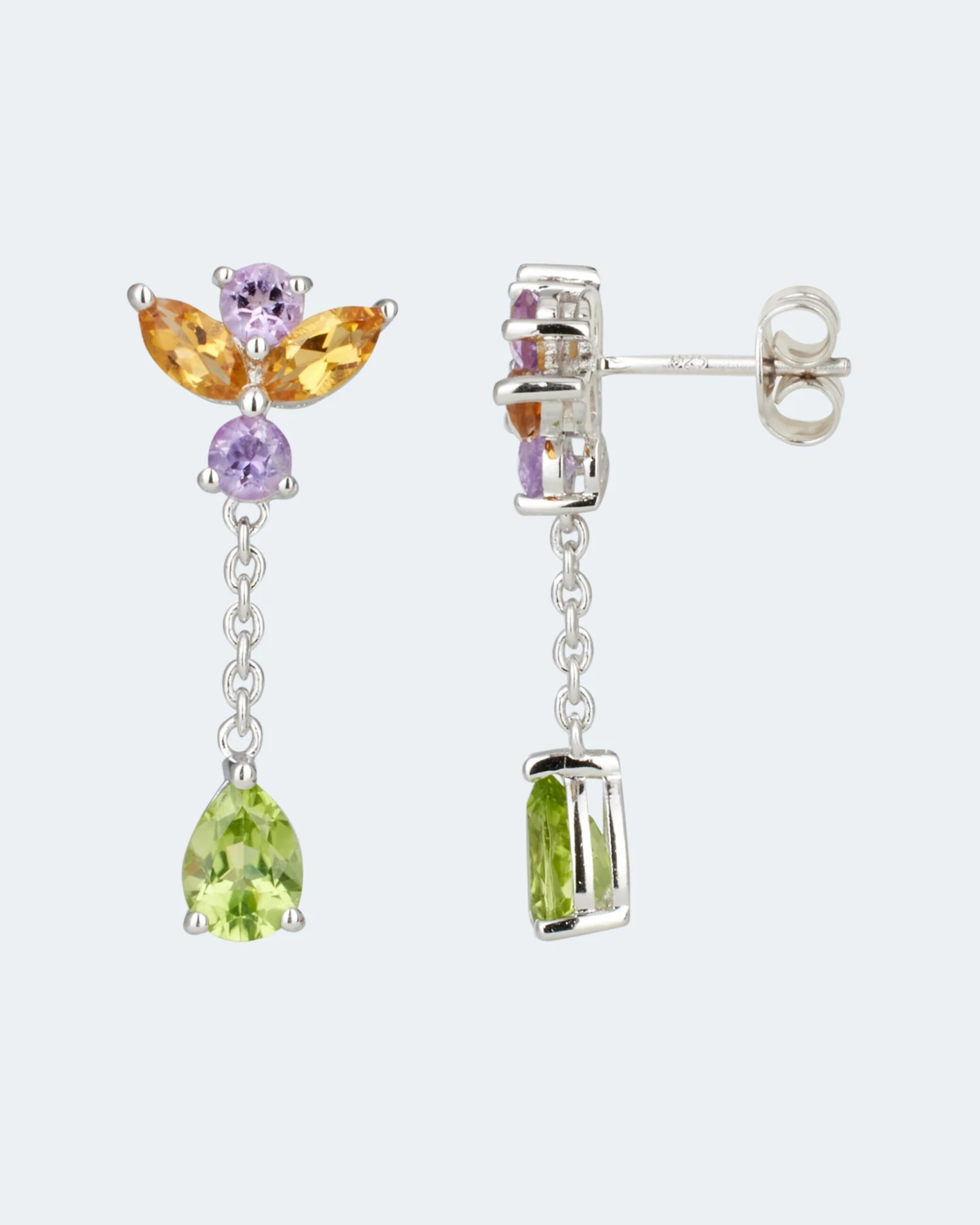 Mit diesem Accessoire veredeln Sie Ihren Look im Handumdrehen: Jeder Ohrhänger ist ein wahres Kunstwerk, bei dem verschiedene Edelsteine harmonisch miteinander kombiniert wurden. Das Design präsentiert je einen Peridot, 2 Citrine und 2 Amethyste in einem elegant-verspielten Rahmen aus 925er Sterlingsilber. Durch die lockere Aufhängung des Peridots ergibt sich immer wieder ein fantastischer Glitzereffekt. Unsere Silber-Ohrhänger mit Multi-Edelsteinen sind das perfekte Accessoire, um Ihrem Look das gewisse Etwas zu verleihen. Tauchen Sie ein in die Welt der Schönheit und des Glamours mit diesem außergewöhnlichen Ohrschmuck!