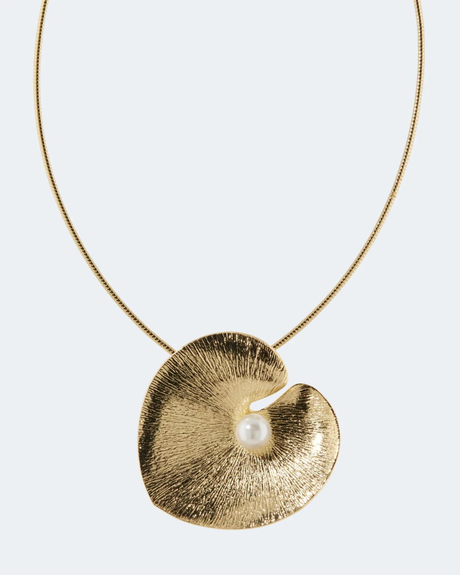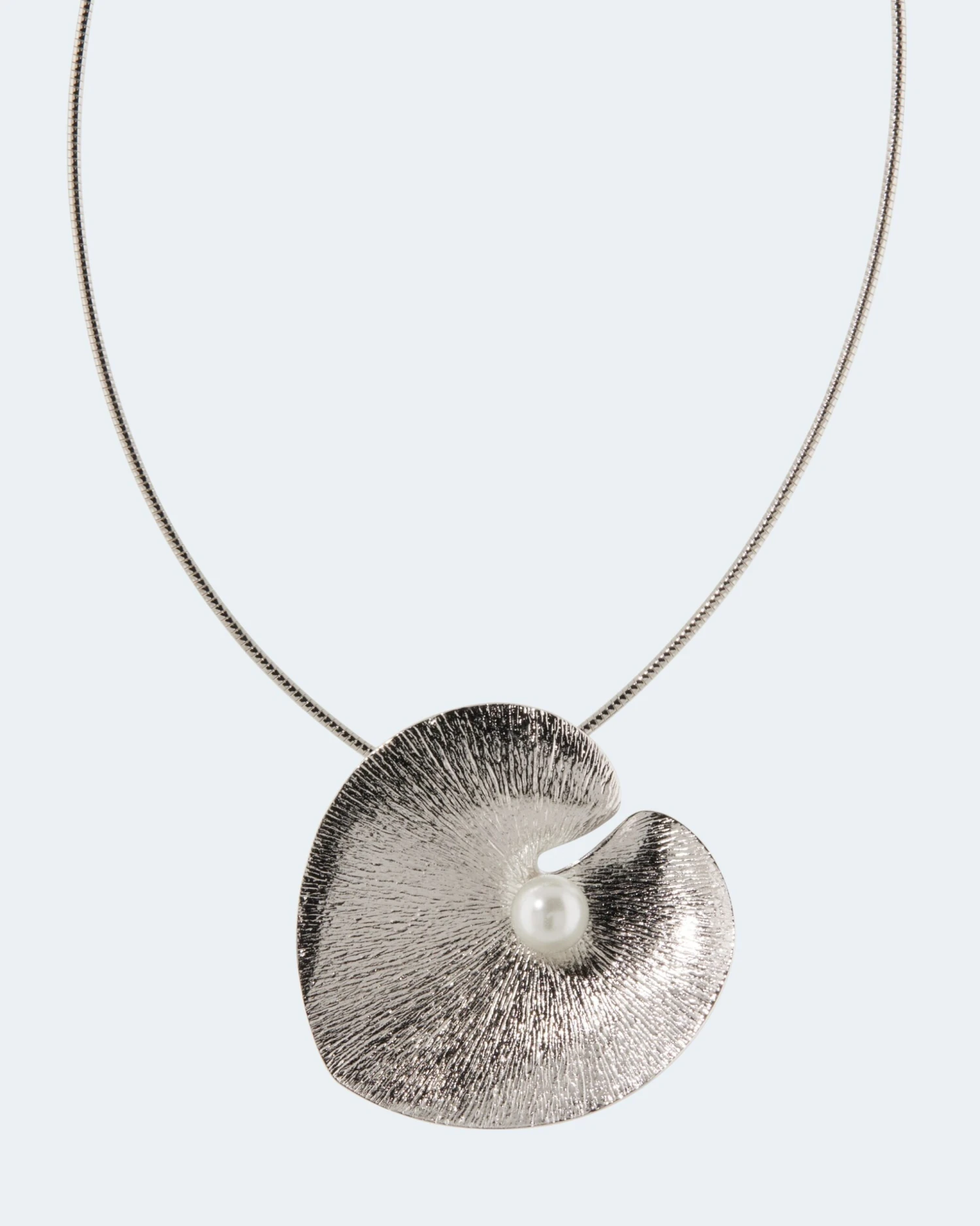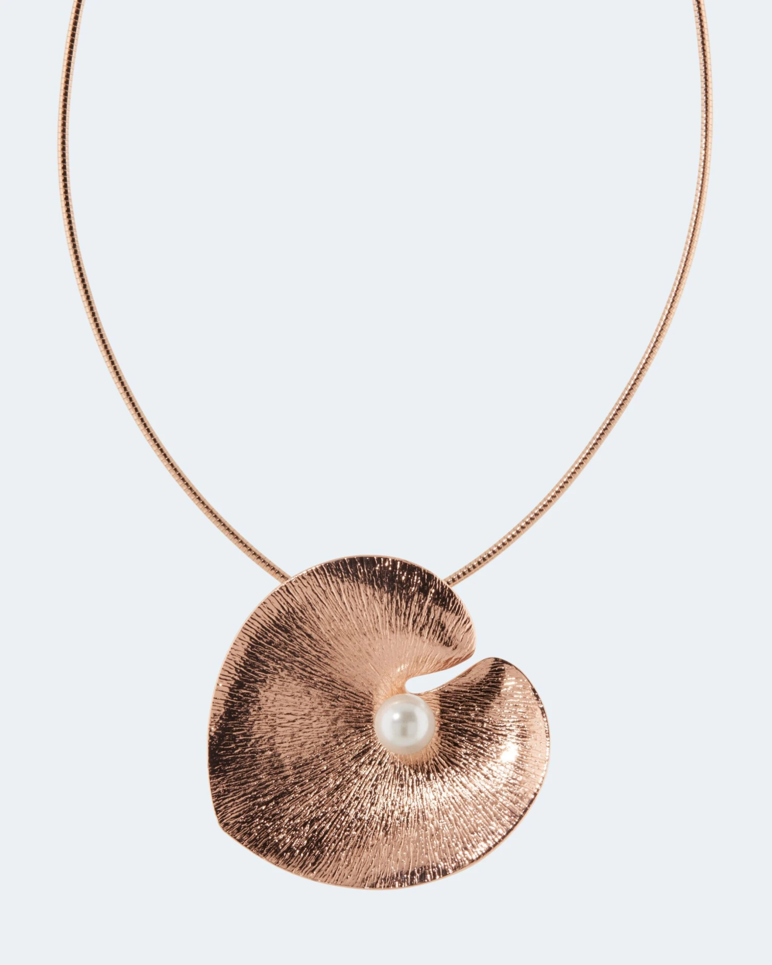 Der Anhänger ist im kunstvollen Blatt-Design gefertigt und mit einer weißen Imitationsperle aus Glas verziert. Das Blatt selbst weist eine filigrane Struktur auf und ist fest mit dem Omegareif verbunden. Ein Karabiner sorgt hier für den sicheren Halt.