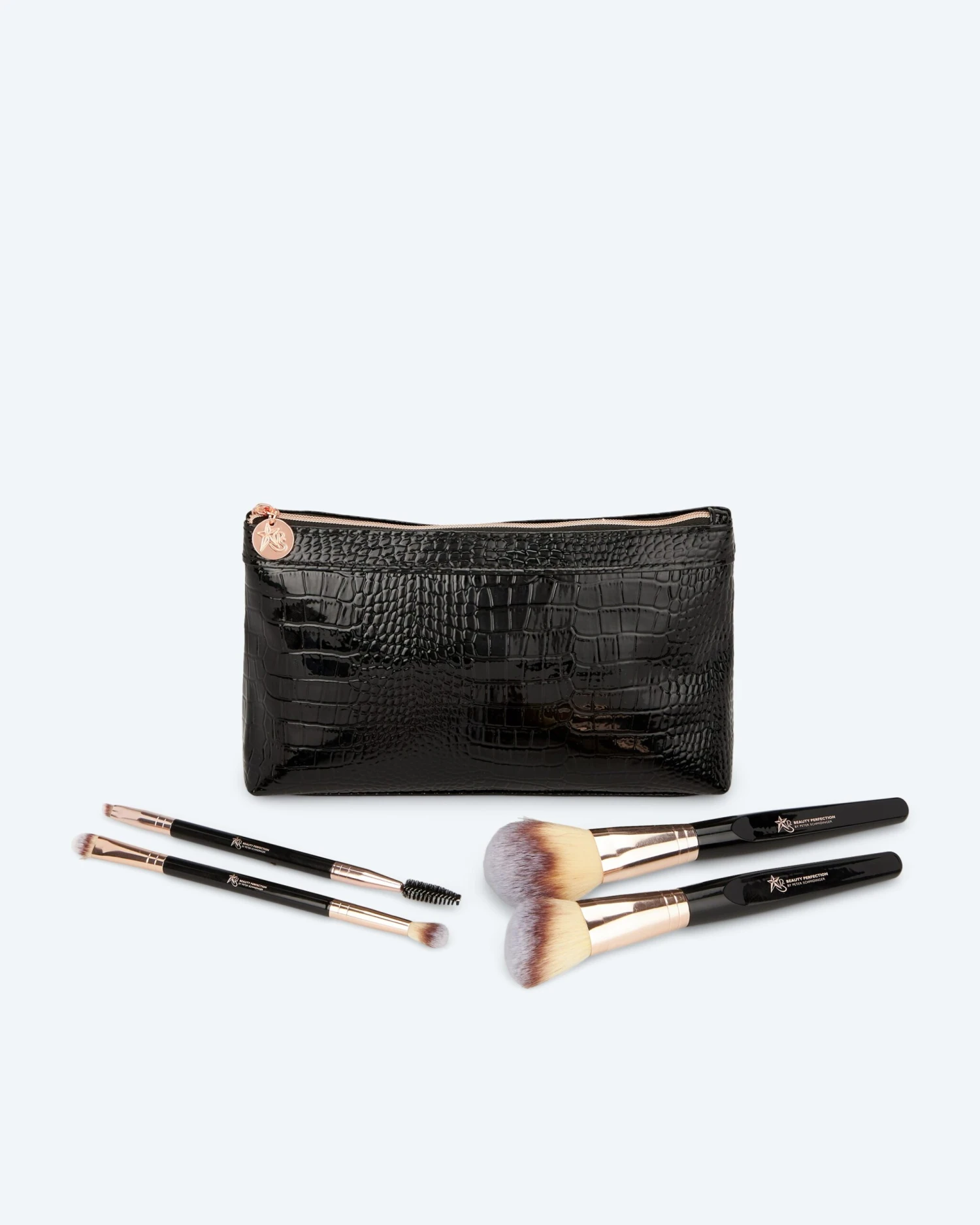 Die Pinsel bestehen aus dreifärbigem, ultra-weichem Synthetikhaar und haben hochglänzend schwarze Griffe mit roségoldener Zwinge. Im eleganten Täschchen in Crocoprint-Optik ist Platz für viele weitere Schmink-Lieblinge von Peter Schmindinger.