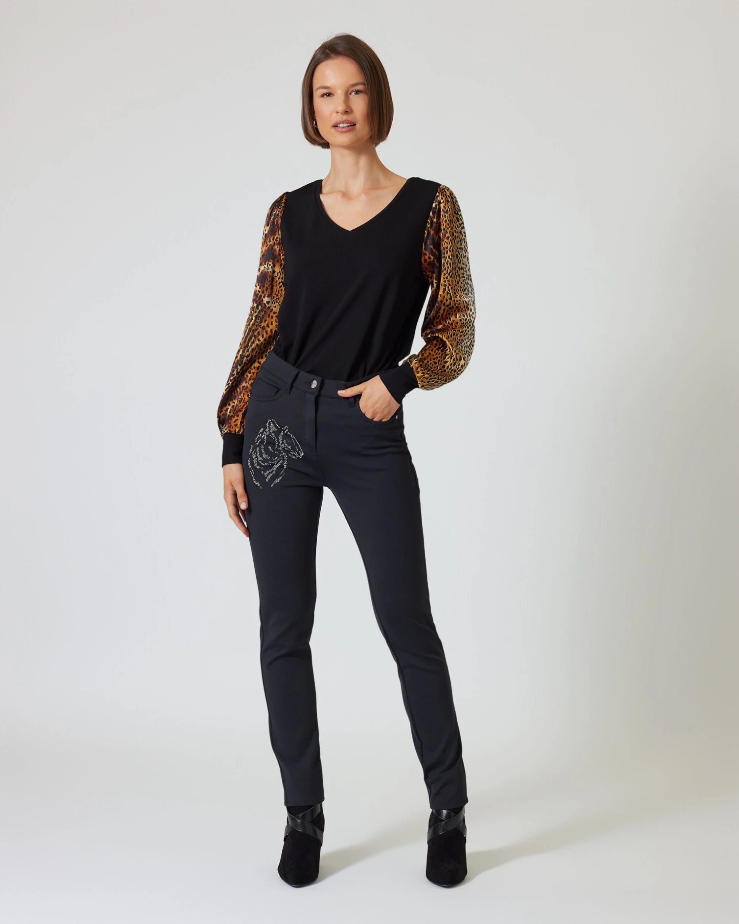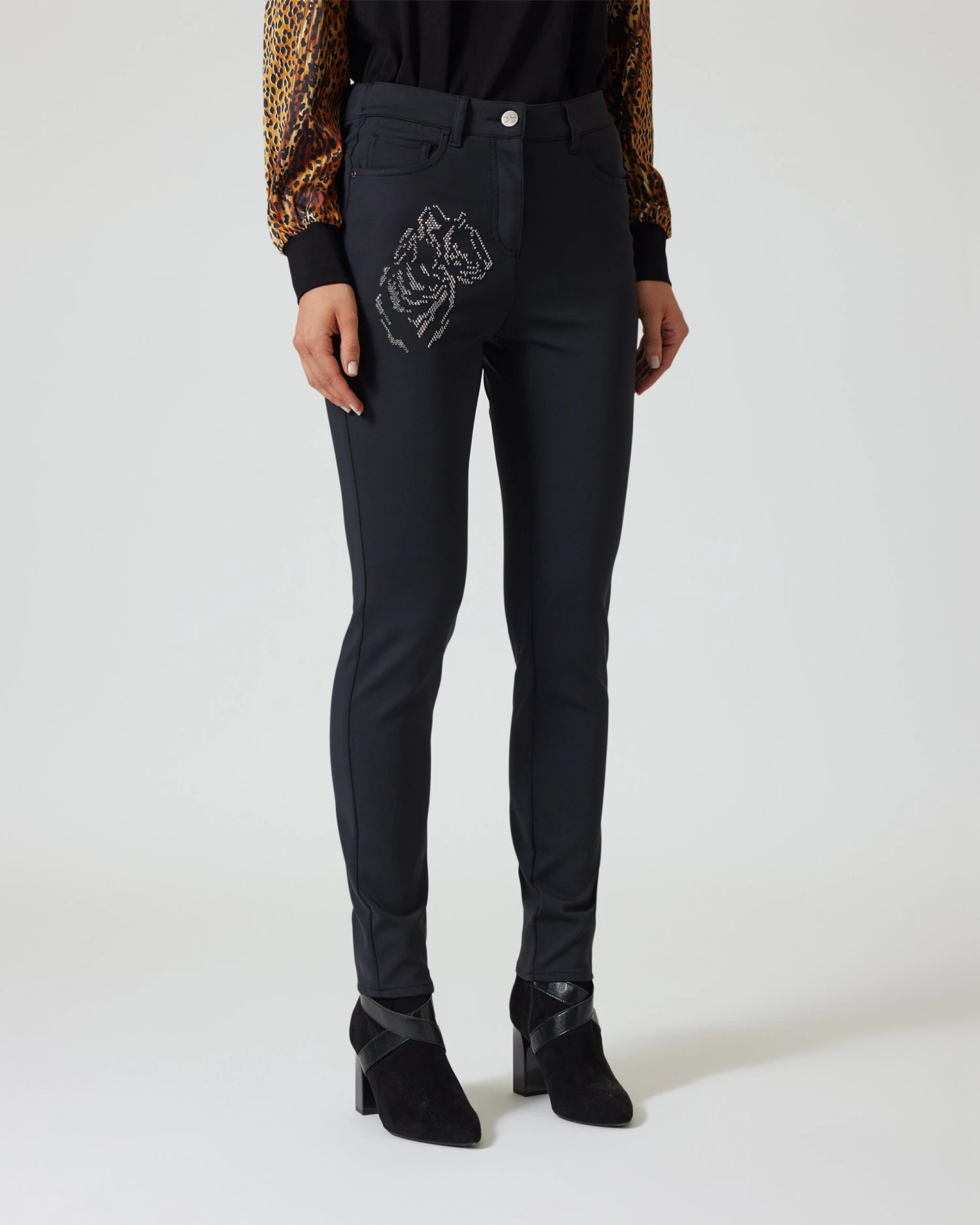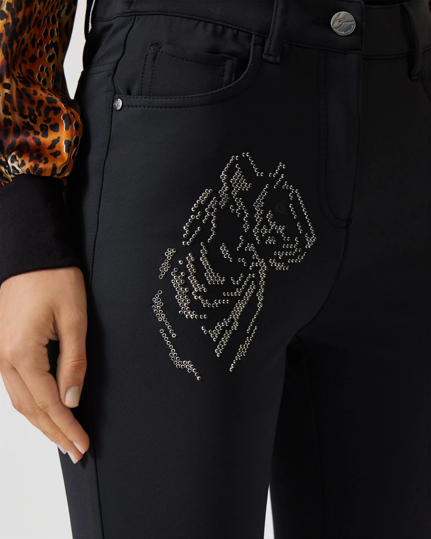Schwarze Hosen sind absolute Lieblingsstücke: Sie passen zu allen Farben und Styles. Dieses Modell von Brian Rennie kommt im beliebten und figurschmeichelndem 5-Pocket-Style in sexy Röhrenform. Das Highlight der Hose ist ein stilisierter Tigerkopf vorne auf der rechten Seite. Damit setzen Sie garantiert ein modisches Statement. Ein weiterer Vorteil: Das Fashion-Piece in feiner Ponte-Qualität trägt sich mit hohem Elasthananteil sehr angenehm und macht jede Bewegung mit.