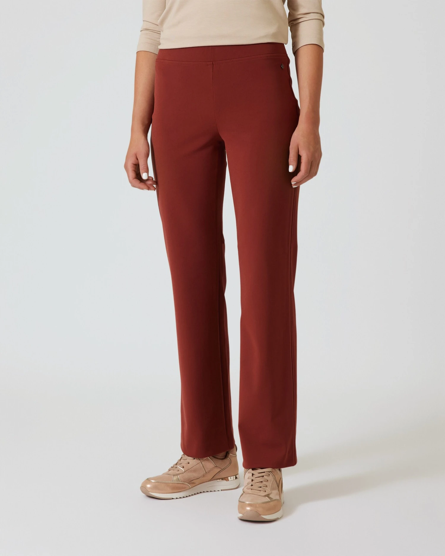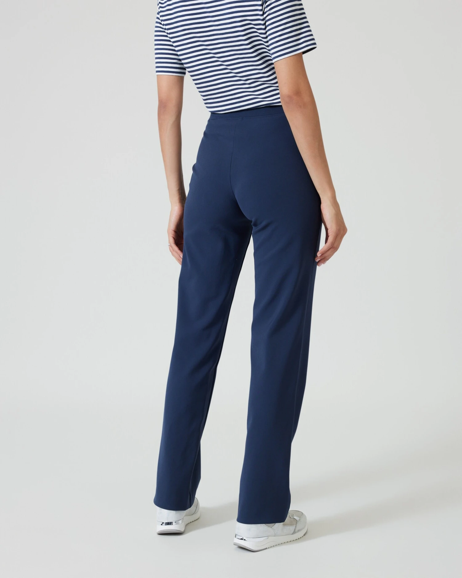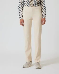 Mit einem hohen Elasthananteil macht die Hose jede Bewegung mit und sitzt jederzeit perfekt. Nichts zwickt und kneift hier. Dabei sitzt der breite, elastische Bund modisch auf Nabelhöhe.