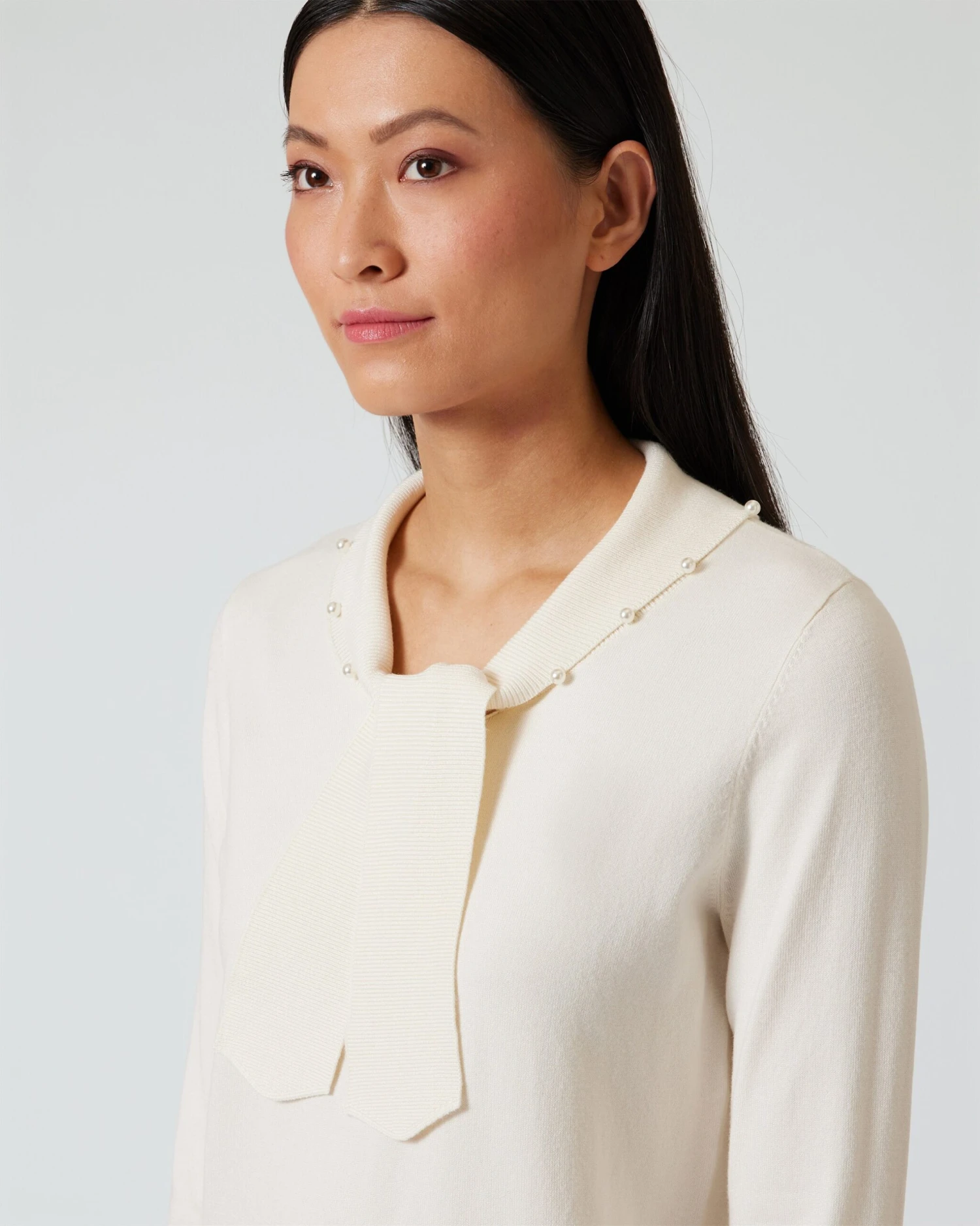 Bei diesem Pullover aus der neuen Alfredo Pauly Kollektion ist das der Schalkragen mit geripptem Saum und der breiten, ebenfalls gerippten Schluppe in der Mitte. Entlang des Kragensaums außerdem mit einer glamourösen Perlenverzierung.