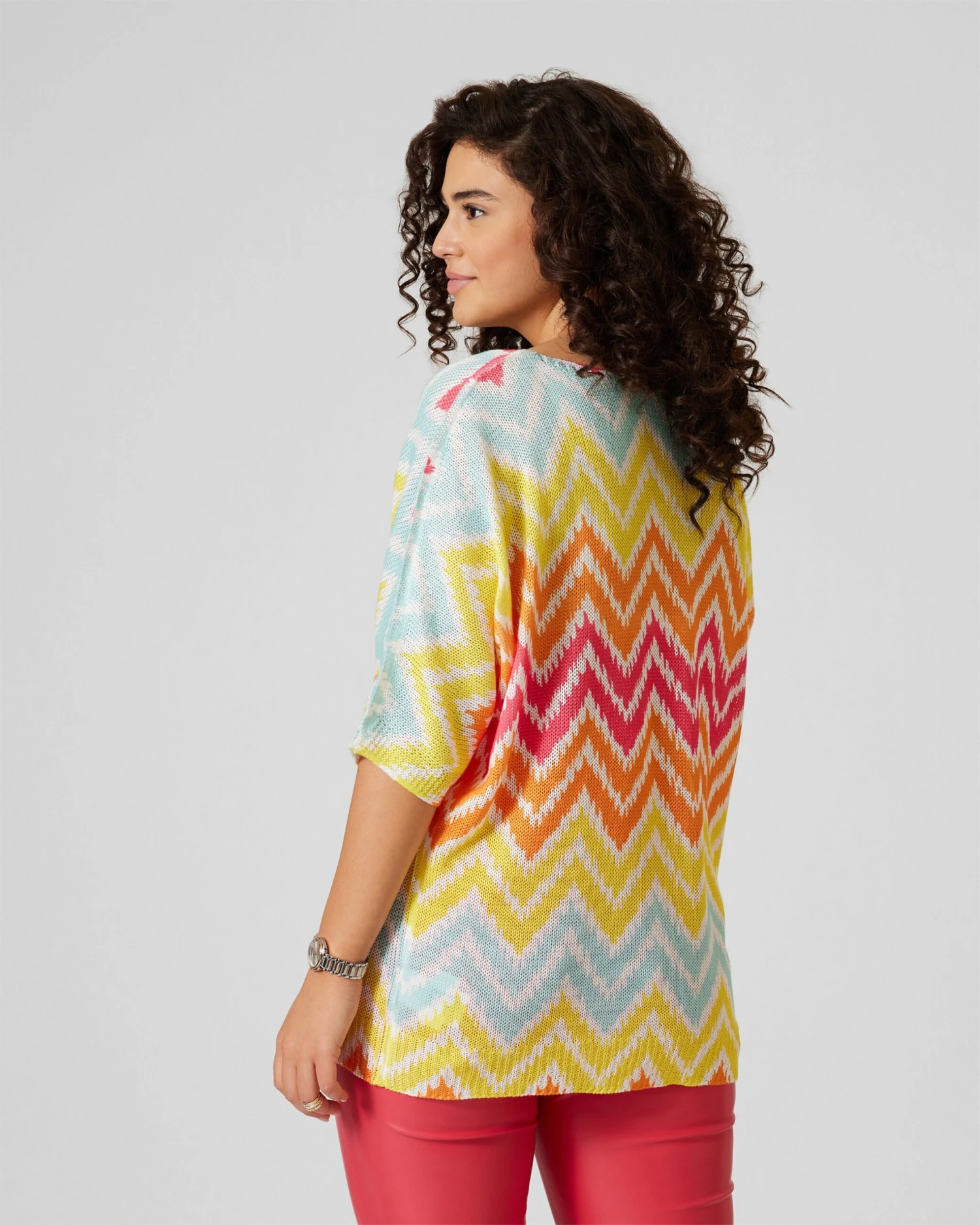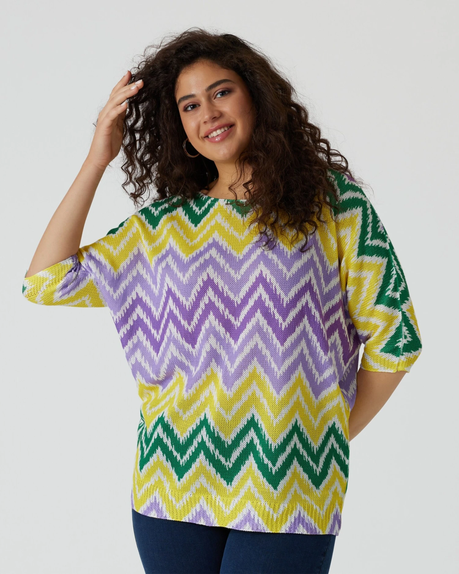 Typisch curvy me: Natürlich besticht Ihr neuer Zick-Zack-Pullover auch durch feminine Details, etwa den abgeflachten Rundhalsausschnitt und die modischen 3/4-Ärmel. Die feine, figurumspielende Qualität betont die feminine Ausstrahlung zusätzlich.