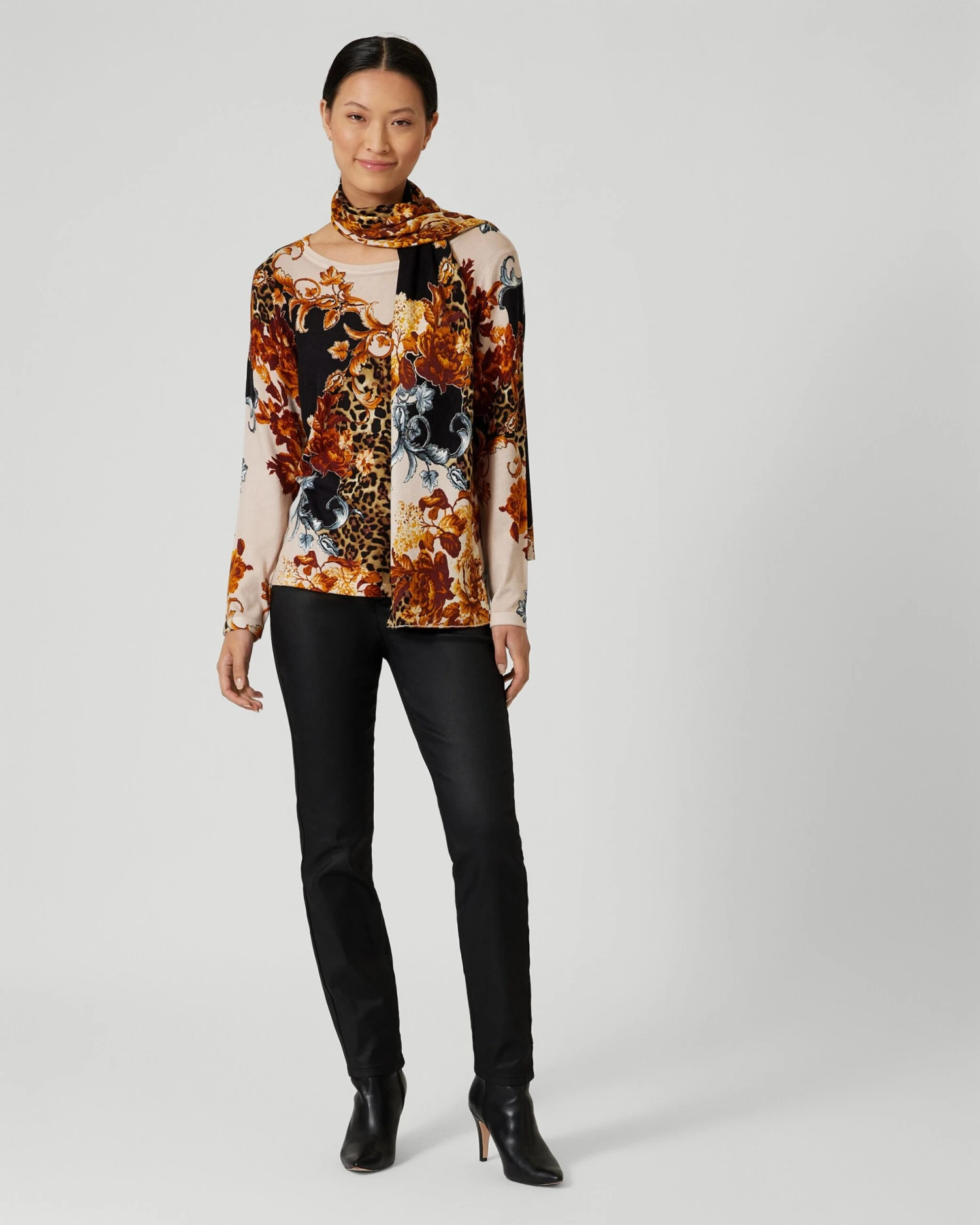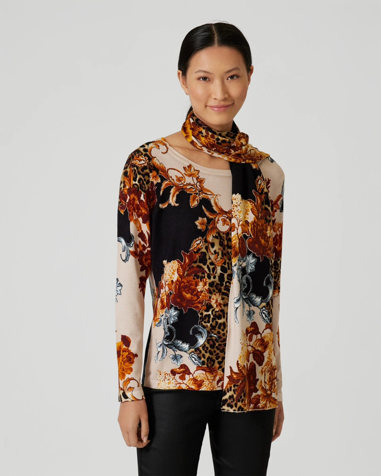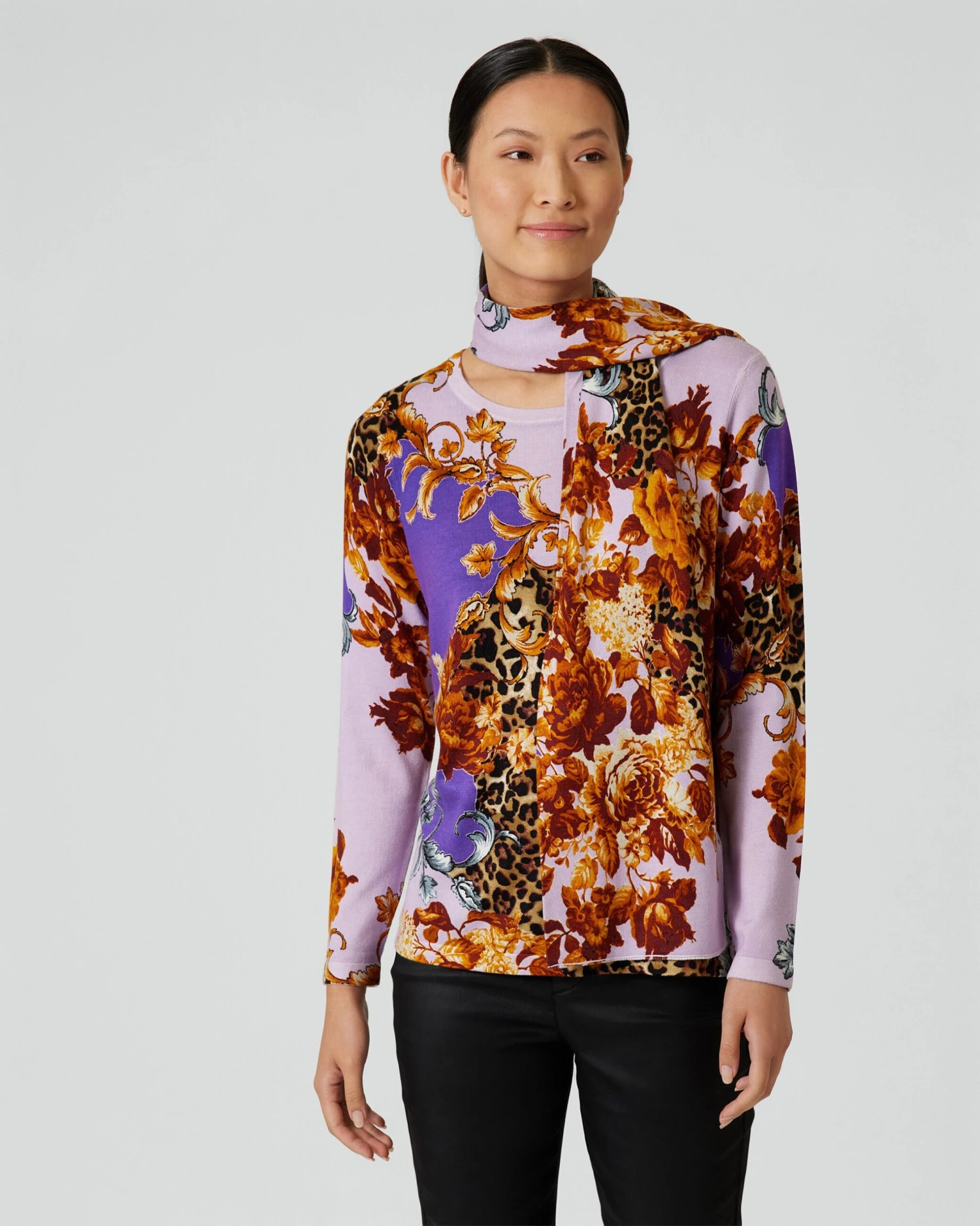 Pullover und Schal zeigen jeweils den gleichen opulenten Druck, bestehend aus verschiedenen expressiven Elementen.