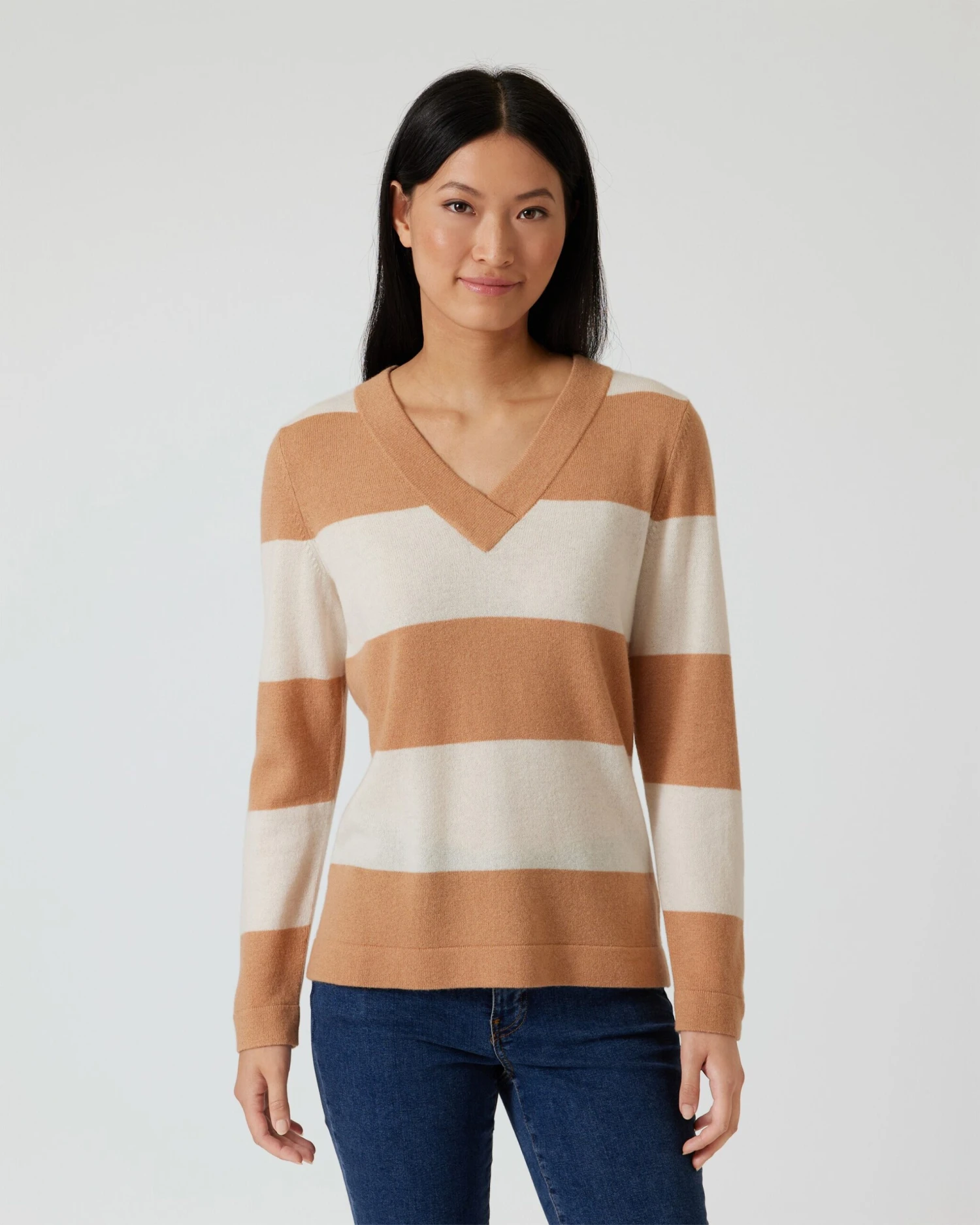 Fashion-Highlight zum Verlieben: Der Pullover entzückt durch sein extra breites Querstreifenmuster in stylischer Bicolor-Optik. Wahlweise zu bestellen in den Trendfarben Magenta oder Walnuss. Wunderschön ergänzt durch den V-Ausschnitt mit breiter, sich in der Spitze überlappender Saumkante. Tipp: Einen Cardigan im selben Design finden Sie unter 459688.