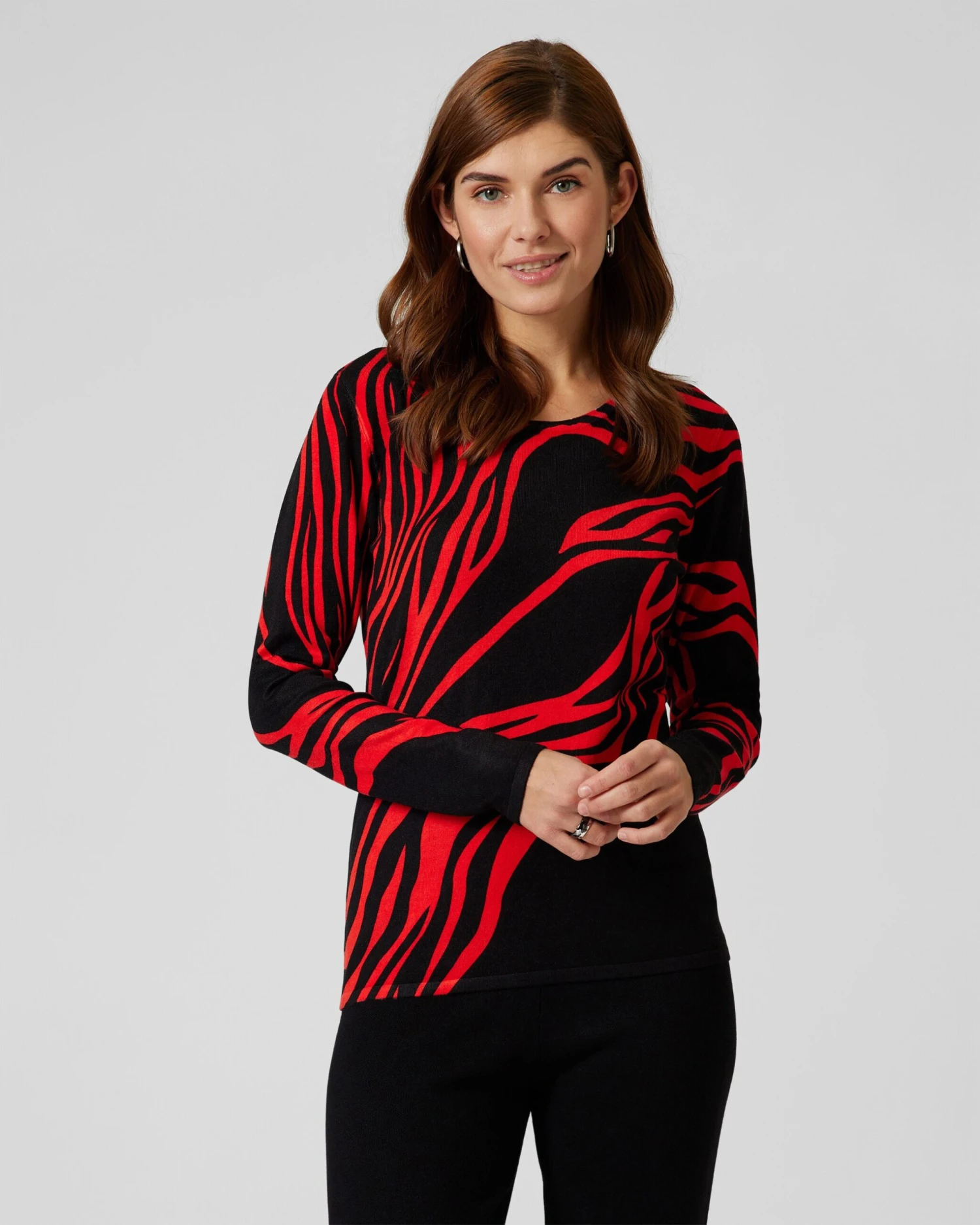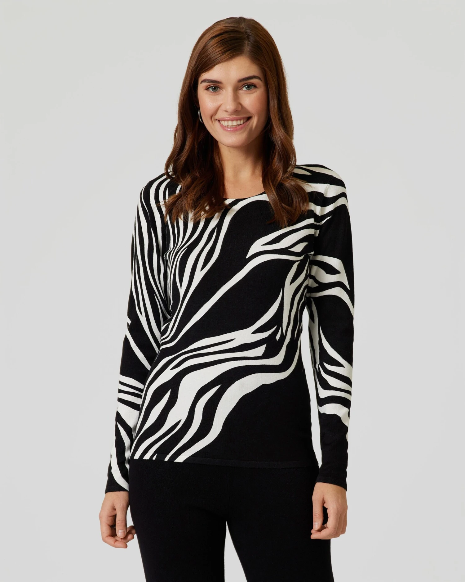 Der auffallende Pullover aus der neuen Ovanti Kollektion trägt den Namen „Welle“. Verantwortlich dafür ist sein fantasievoller Allover-Druck aus grafischen Elementen, den man für eine künstlerisch verfremdete Darstellung der Wogen des Meeres halten kann.