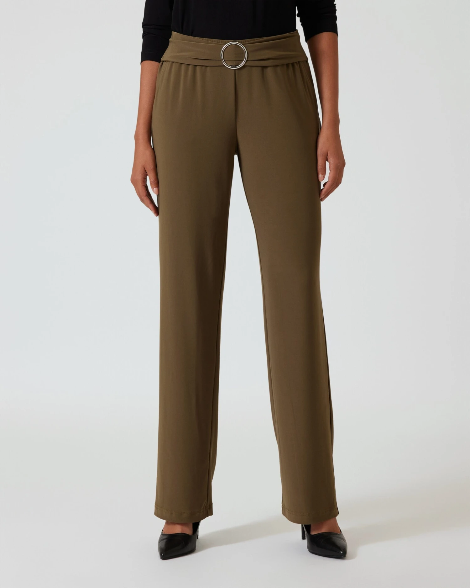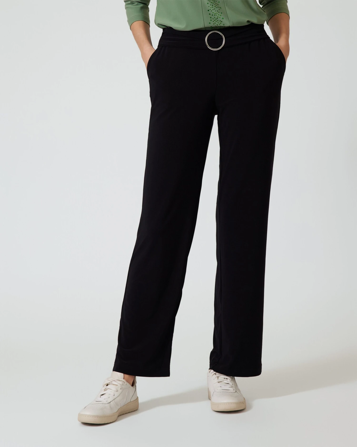 Der modische Clou bei dieser Hose ist die Bundgestaltung: Da gibt es ein breites, tonales Band mit Faltenwurf in Gürtel-Optik, abgerundet durch eine mit große, silberfarbene Fake-Deko-Schließe in runder Form.