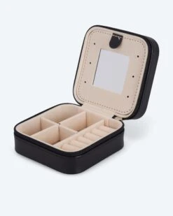 In diesem so hübschen wie praktischen Schmucketui von Diajeune sind Ihre Schmuckschätze immer sicher verwahrt – ob zu Hause oder auf Reisen. Das kompakte, schwarze Etui bietet Platz für 3 Ketten, 6 Ohrstecker und 6 Ringe. Der Stauraum lässt sich bequem an die Anforderungen anpassen. Ein kleiner, eingearbeiteter Spiegel gibt Ihnen die Möglichkeit, den Sitz und die Optik Ihrer Schmuckstücke zu überprüfen.
