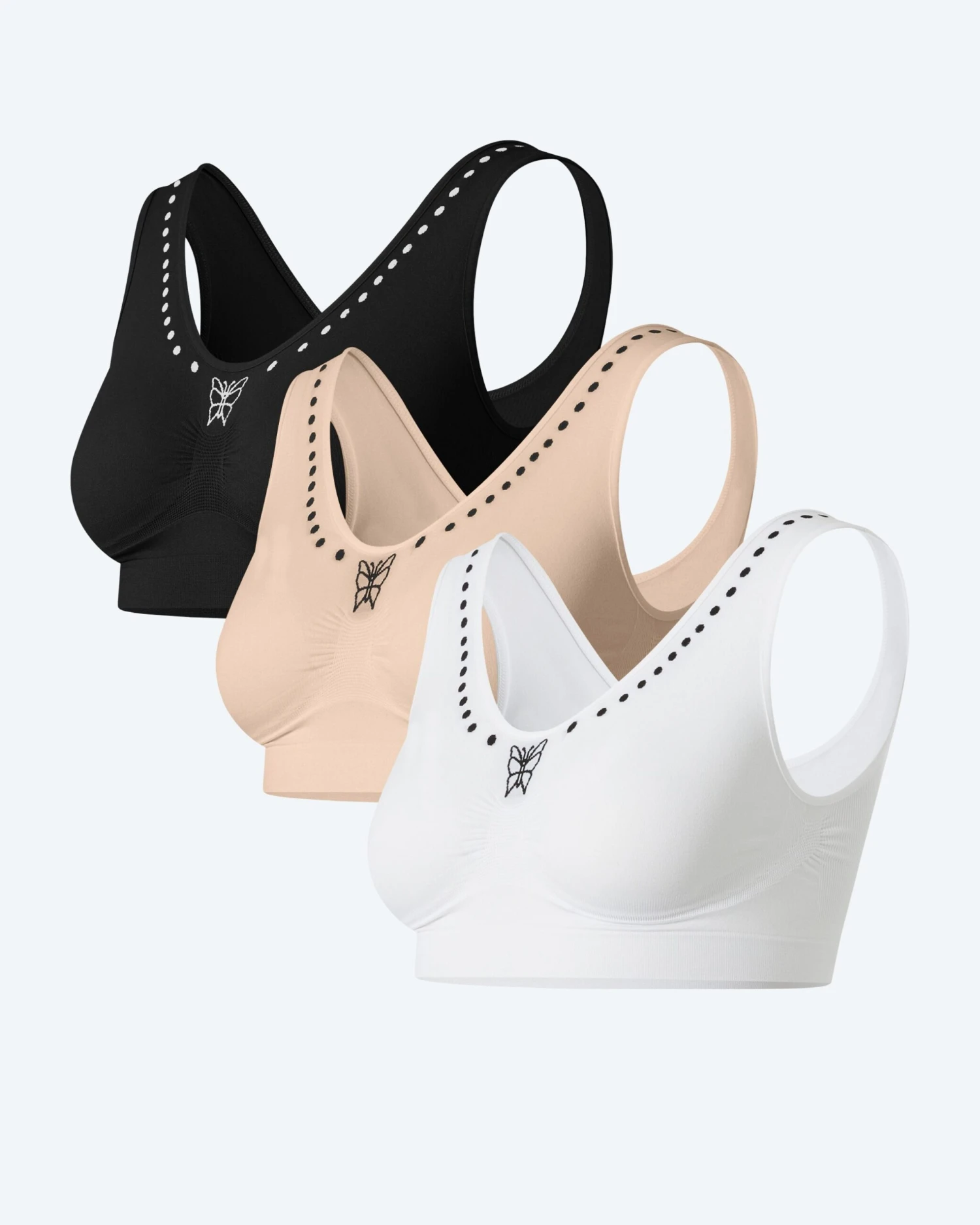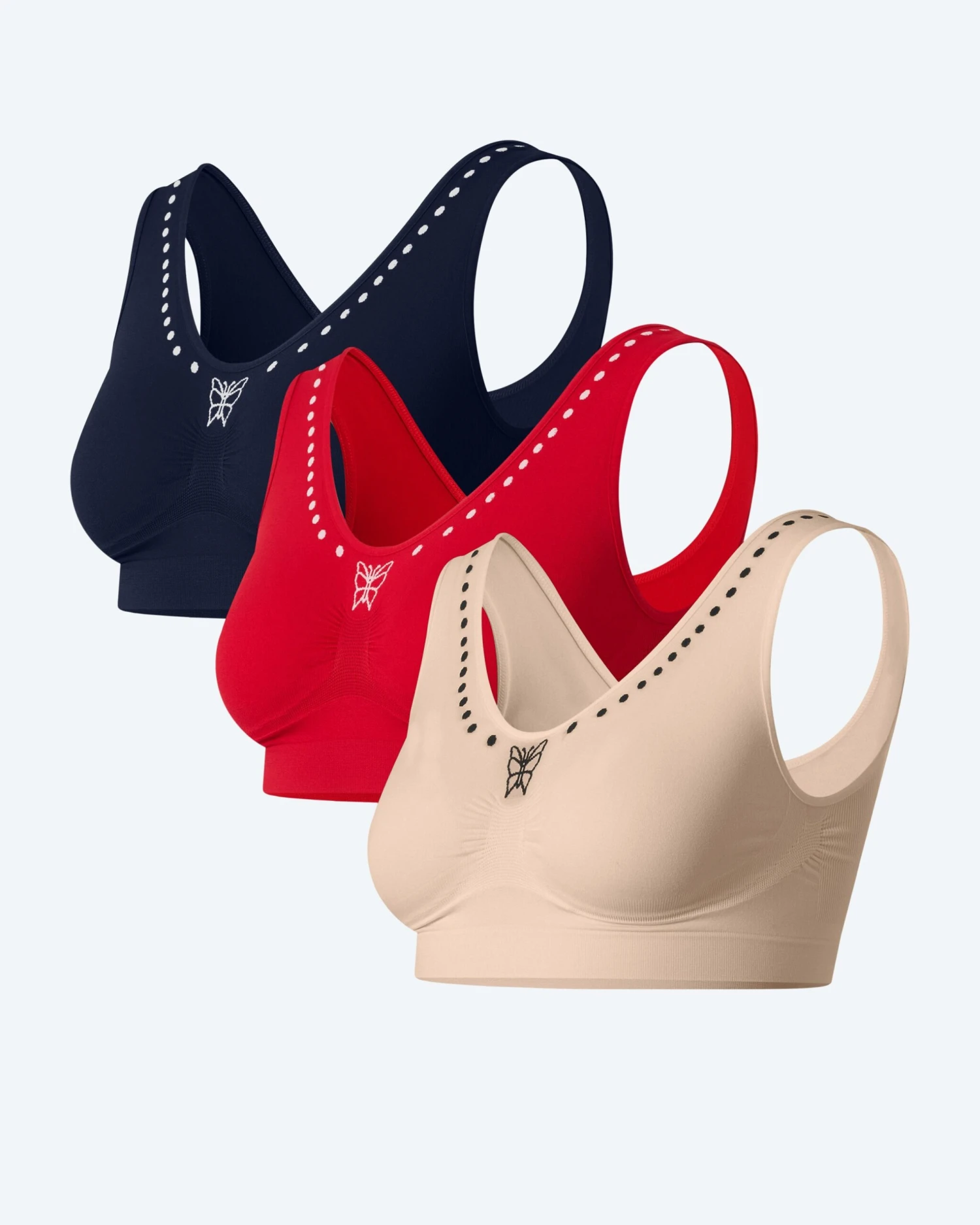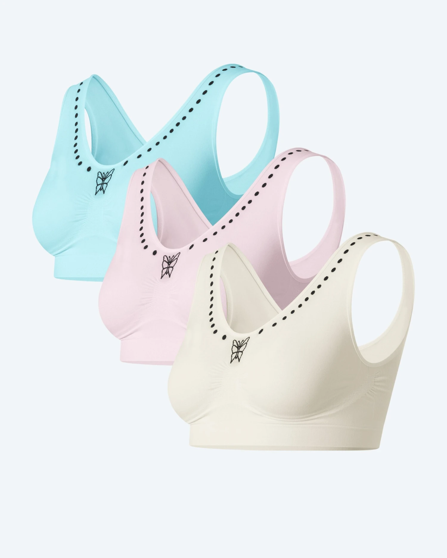 Diese drei BHs haben eine bequeme Bustierform, die super sitzt. Dazu gibt es breite Träger, die besten Halt bieten und einen verführerischen V-Ausschnitt. Unterhalb des Ausschnitts mit Pünktchen sind die BHs mit einem Schmetterling verziert. Bis auf die Dekomotive in Kontrastfarbe, sind die BHs unifarben.
