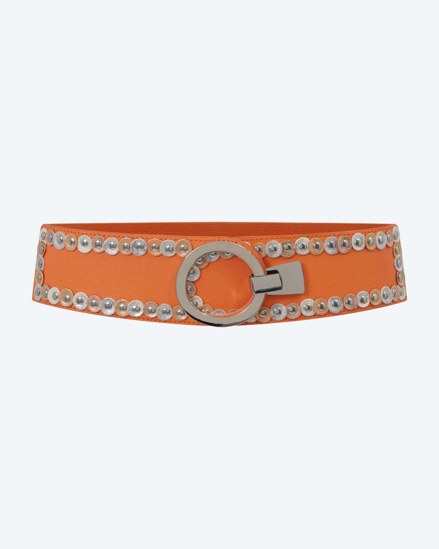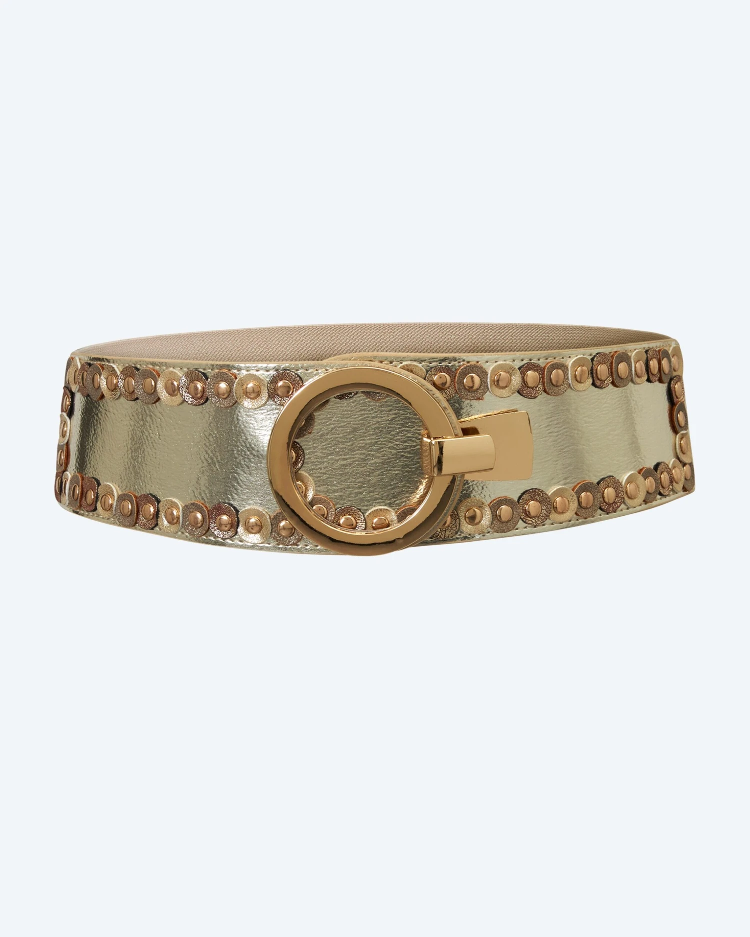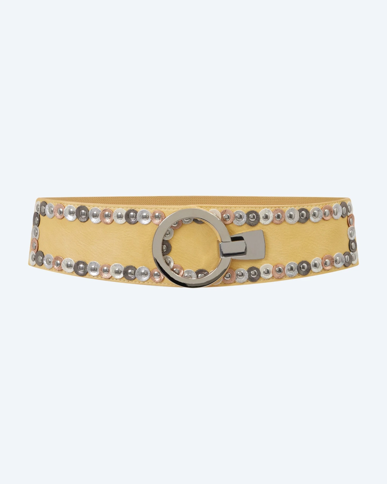 Der breite Gürtel ist mit metallisch glänzenden, flachen Nieten besetzt und bringt so einen Hauch Rock ’n Roll in Ihren Style. Weiterer Blickfang: Die tolle Zierschnalle.