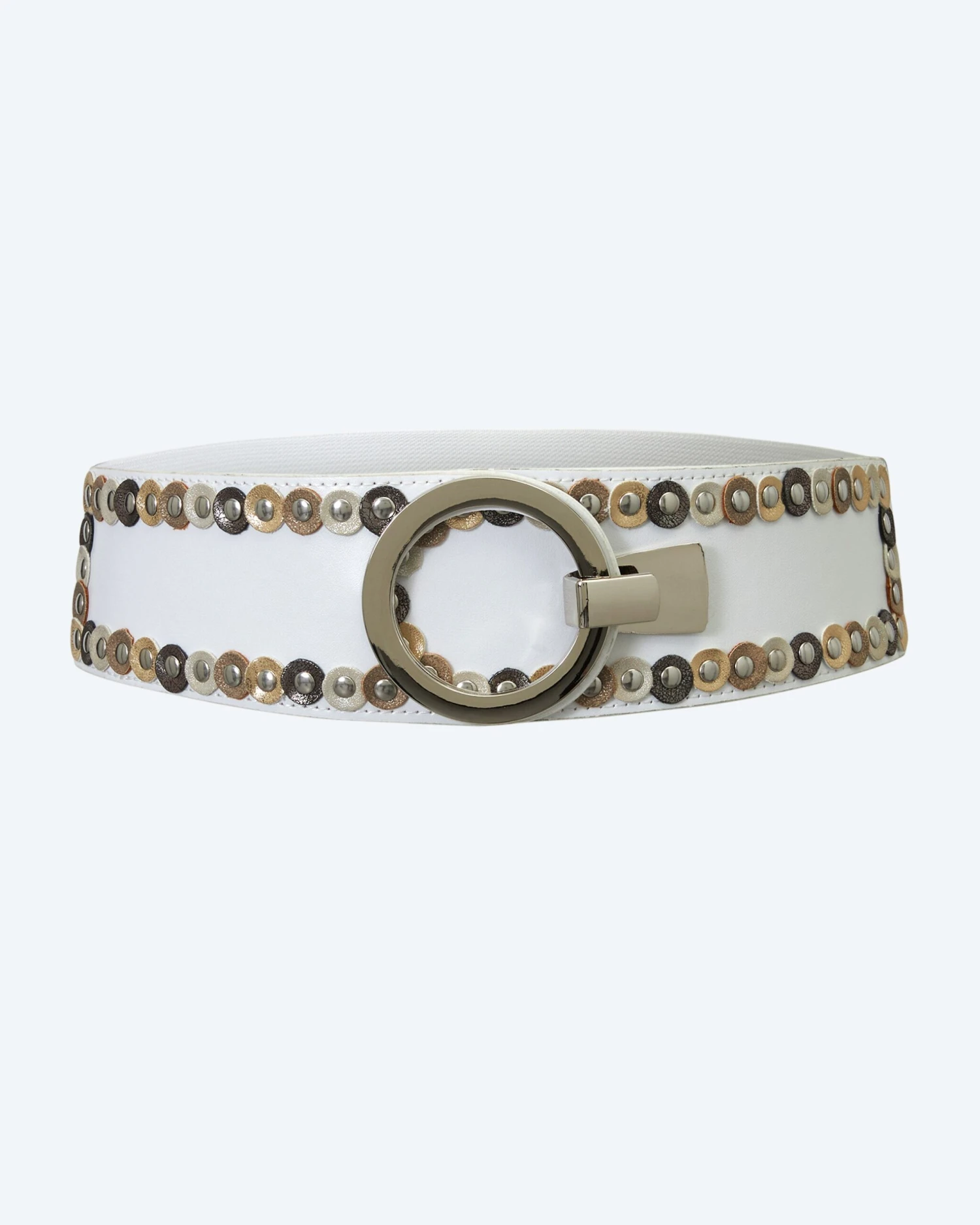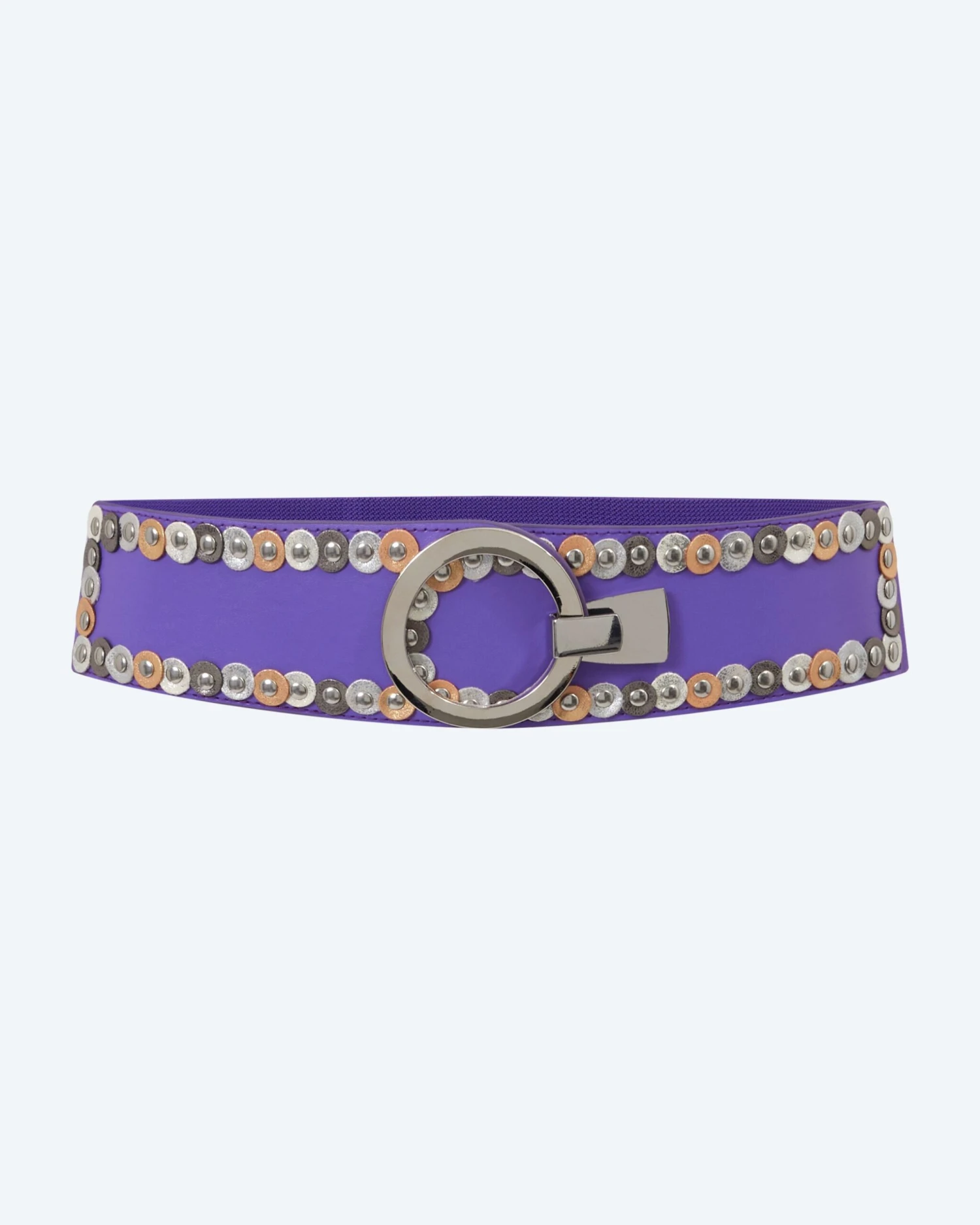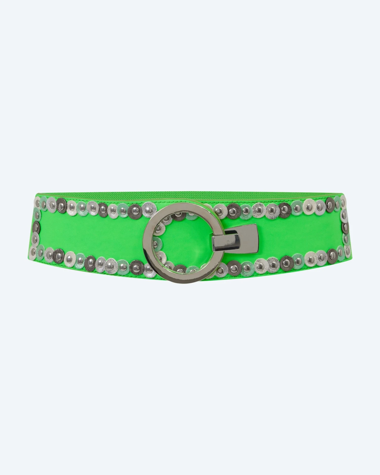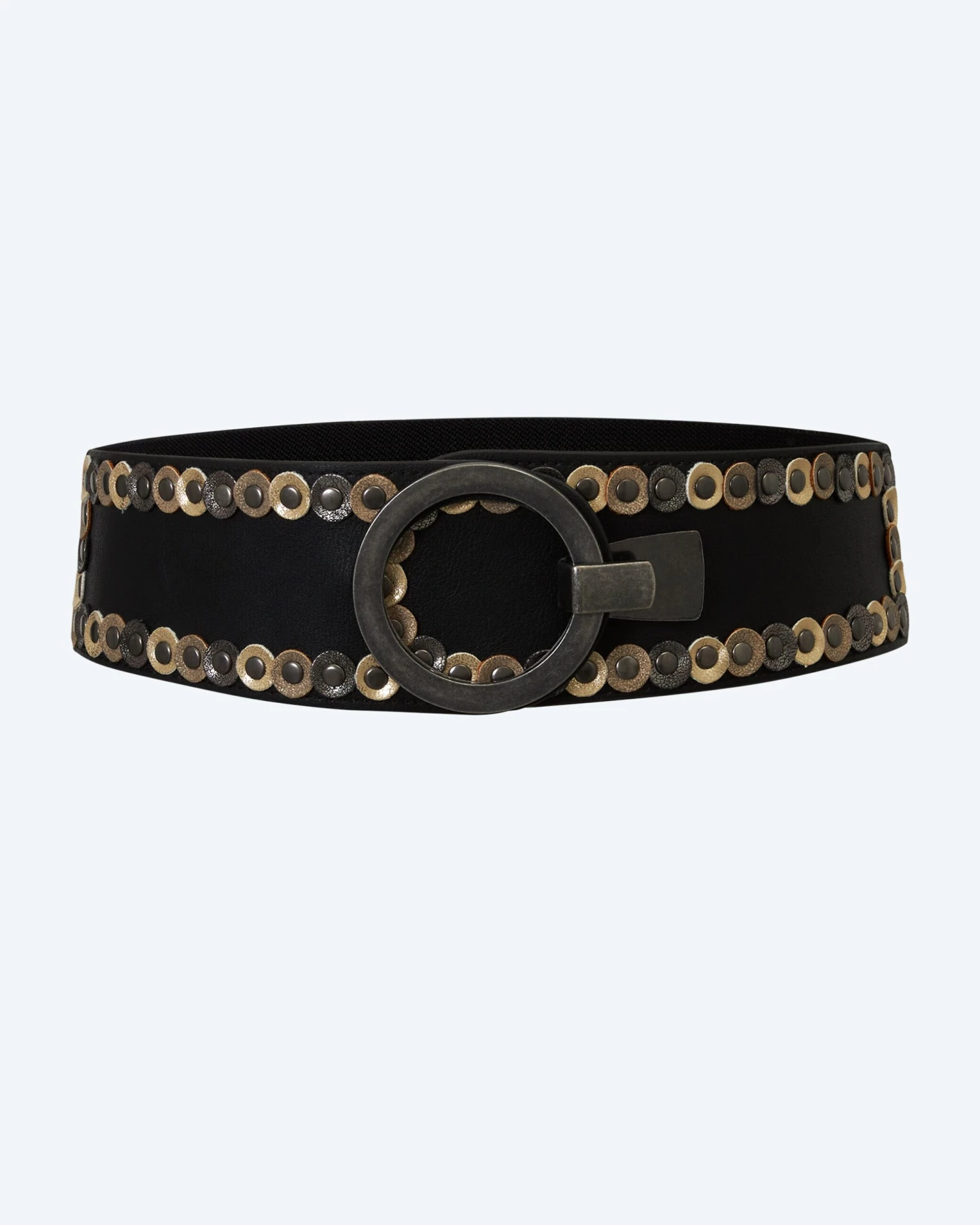 Der breite Gürtel ist mit metallisch glänzenden, flachen Nieten besetzt und bringt so einen Hauch Rock ’n Roll in Ihren Style. Weiterer Blickfang: Die tolle Zierschnalle.