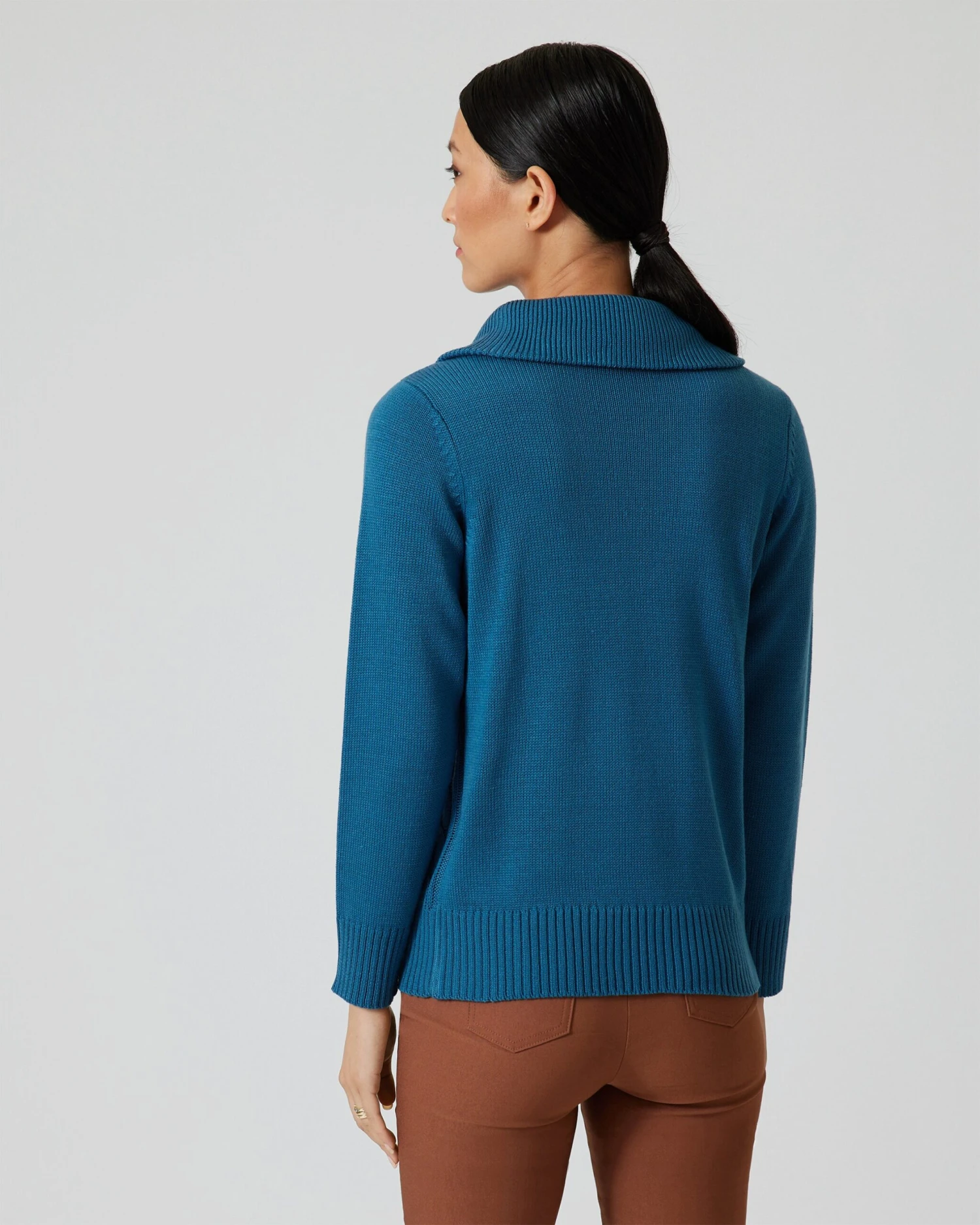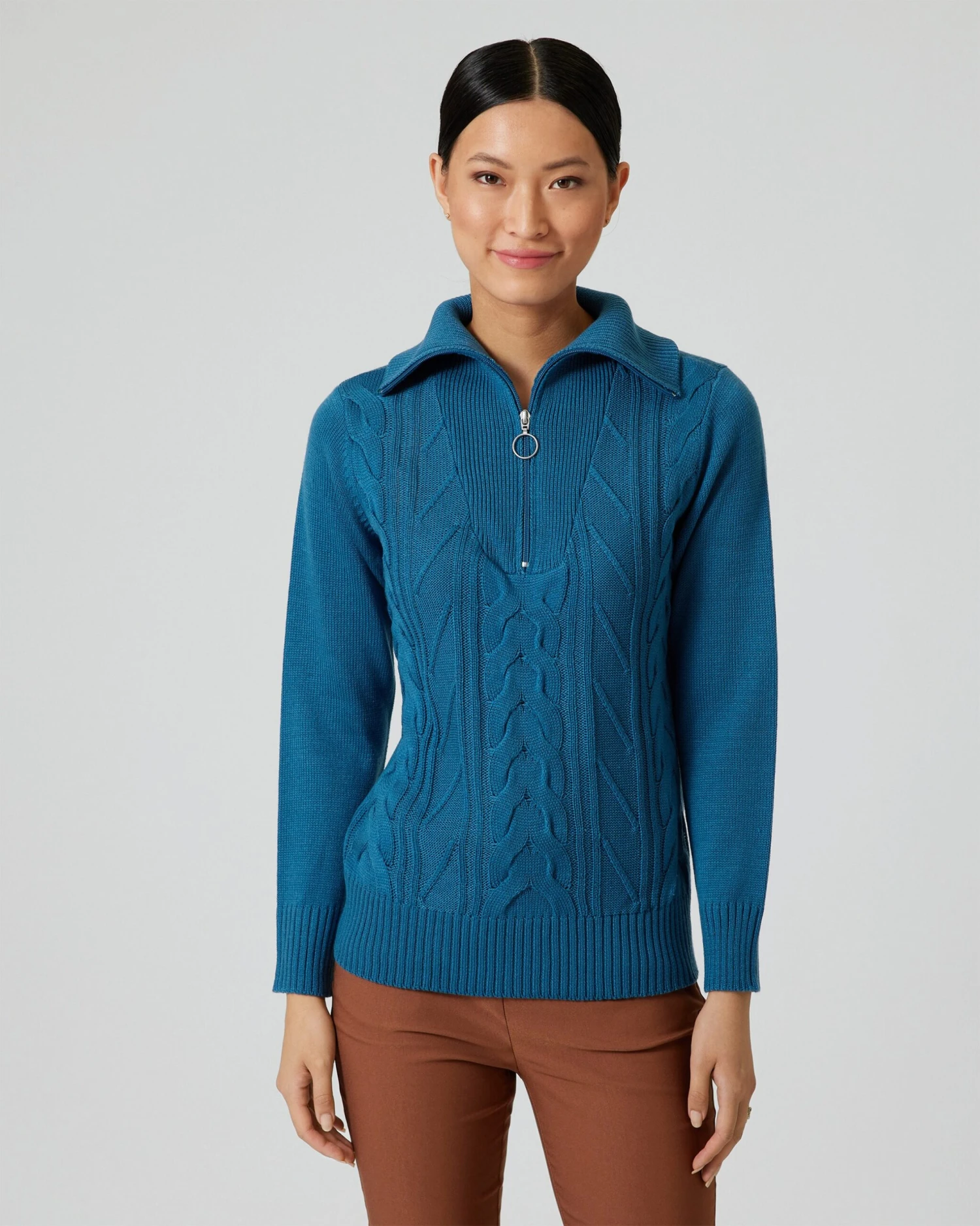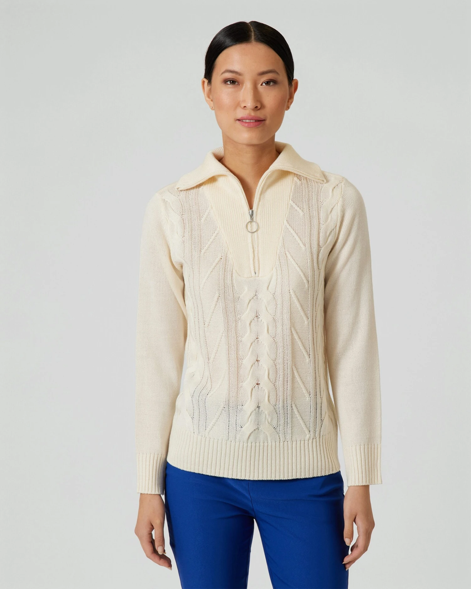 Der modisch sportive Troyer von Helena Vera ist mit einem dekorativen Zopfstrickmuster versehen und zeigt den namensgebenden Kragen. Die modische Farbpalette spiegelt die Trendaktualität, ebenso der feminin taillierte Schnitt.