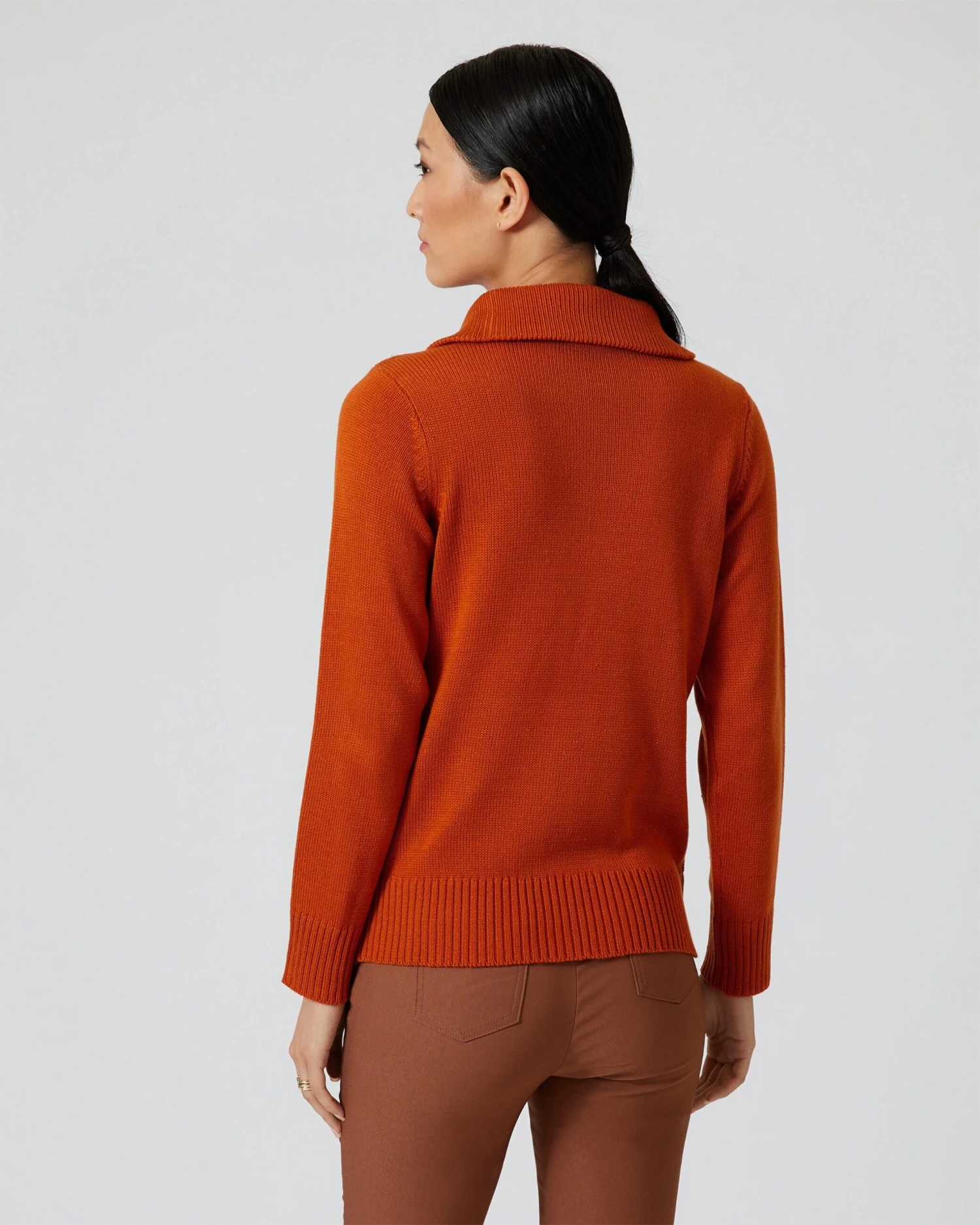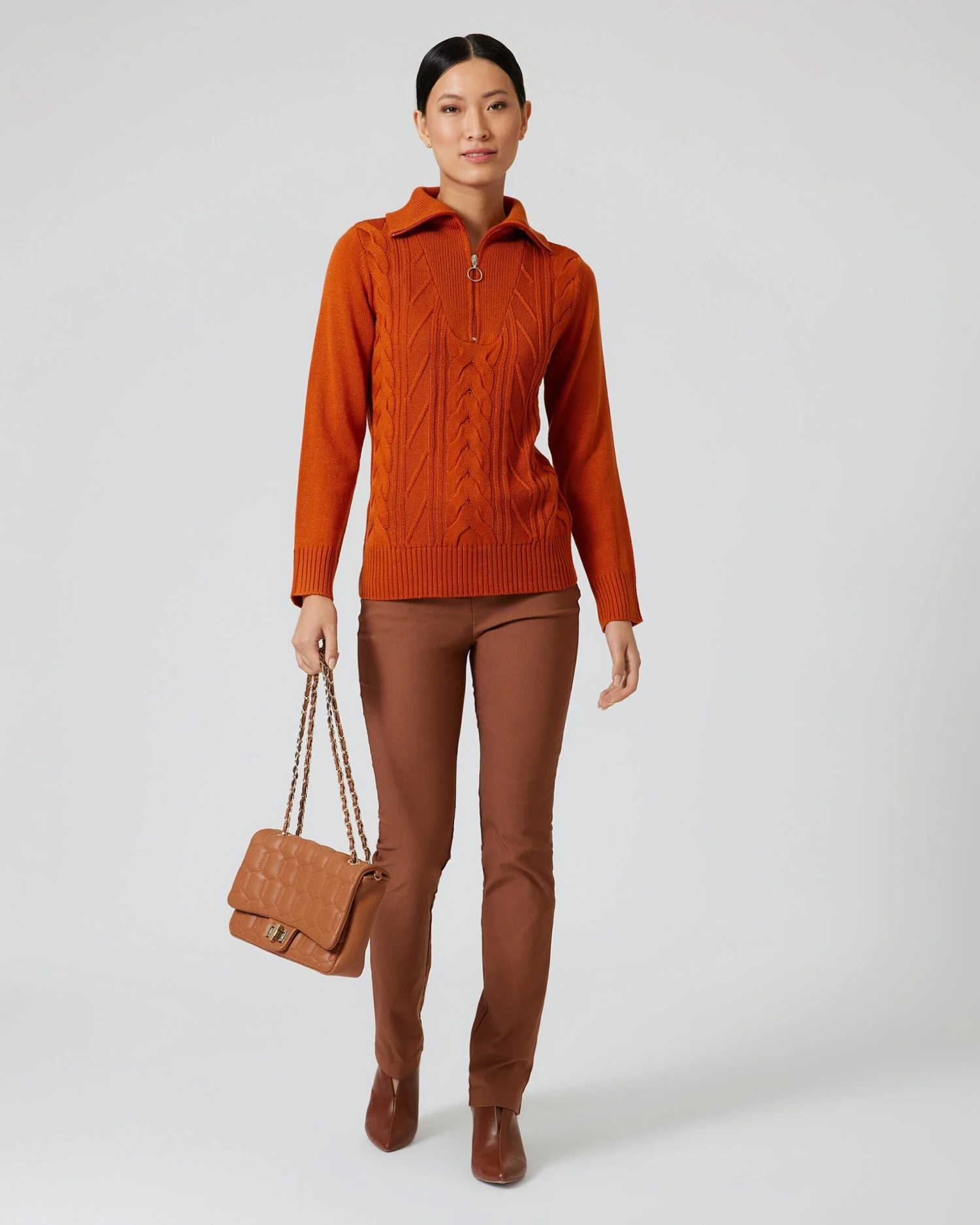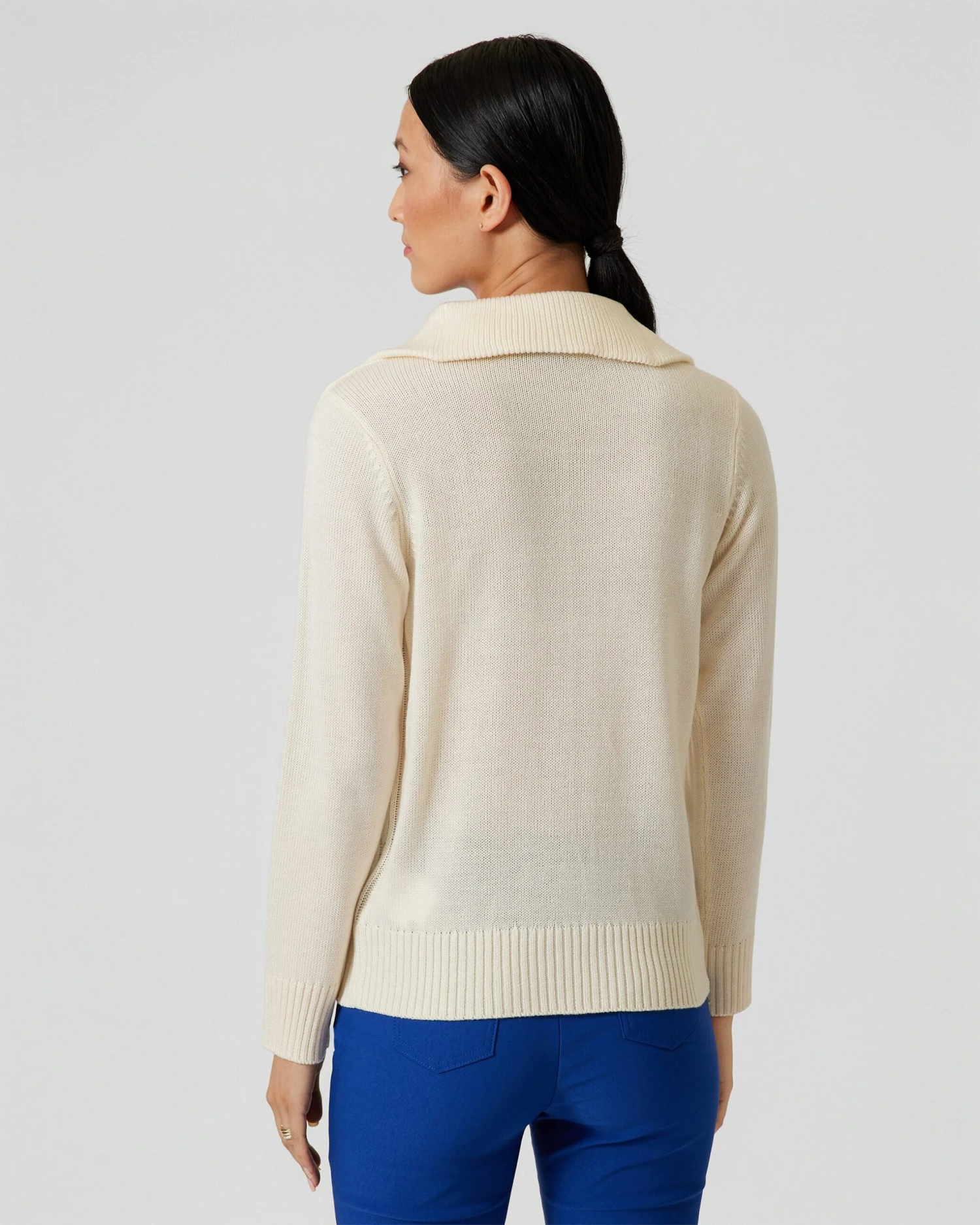 Der modisch sportive Troyer von Helena Vera ist mit einem dekorativen Zopfstrickmuster versehen und zeigt den namensgebenden Kragen. Die modische Farbpalette spiegelt die Trendaktualität, ebenso der feminin taillierte Schnitt.