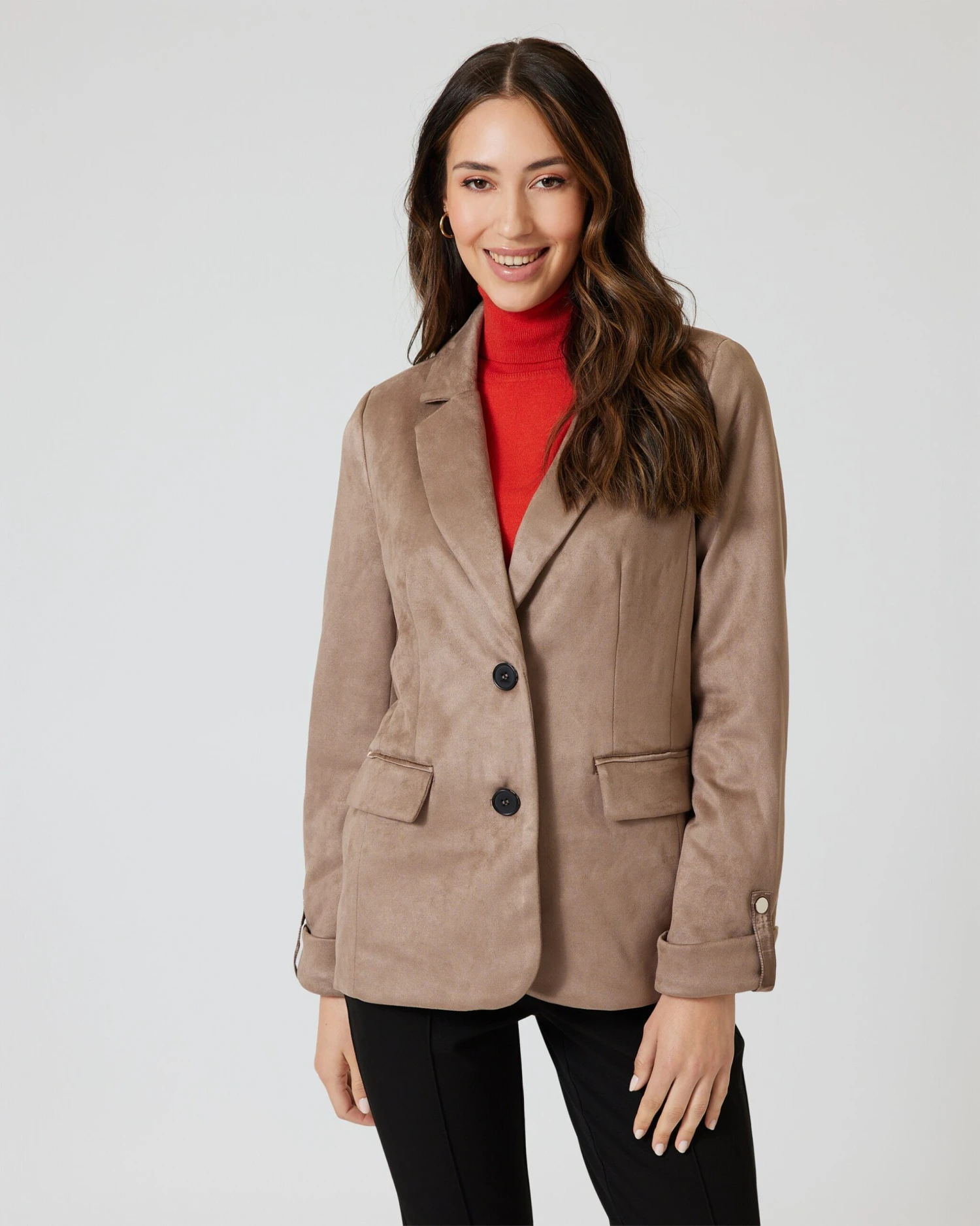 Dieser wunderschöne Blazer schafft mühelos die Kombination aus Trend-Piece und unkompliziertem Begleiter zum Wohlfühlen. Das Uni-Design in Nougat harmoniert mit den unterschiedlichsten Hosenfarben. Schick auch die Machart aus feinem Velours-Lederimitat. Ein Blazer mit Hinguck-Garantie!