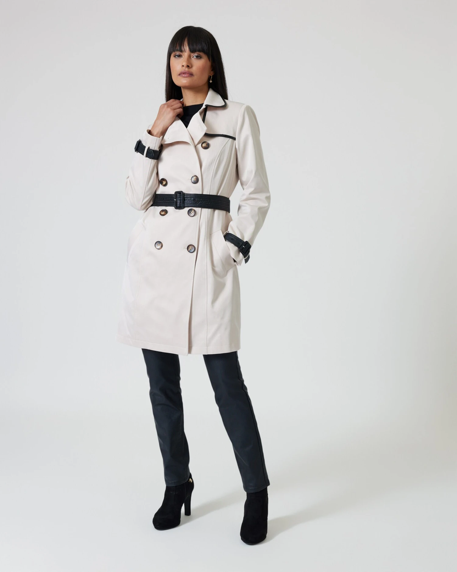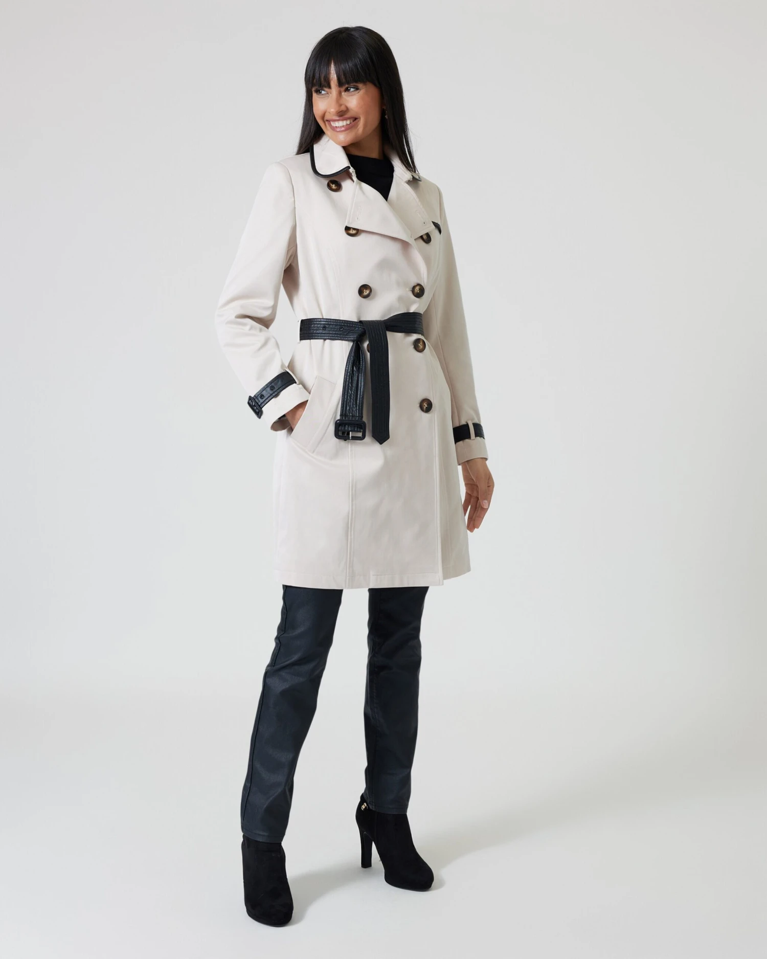 Dieser Trenchcoat verleiht Ihnen einen Hauch von zeitloser Eleganz und ist ein Must-Have für jede modebewusste Frau. Das hochwertige Material sorgt für angenehmen Tragekomfort und eine perfekte Passform. Der klassische Reverskragen gibt dem Mantel eine raffinierte Note. Eingefasst in einen Kontraststreifen aus Lederimitat wird ein echter Eye-Catcher daraus. Der Lederimitat-Gürtel betont Ihre Taille und sorgt für eine feminine Silhouette. Offen getragen blitzt das Futter im Animal-Design hervor und setzt tolle Akzente. Ob im Büro, bei besonderen Anlässen oder in der Freizeit – dieser Trenchcoat ist vielseitig kombinierbar und wird Sie immer perfekt kleiden.