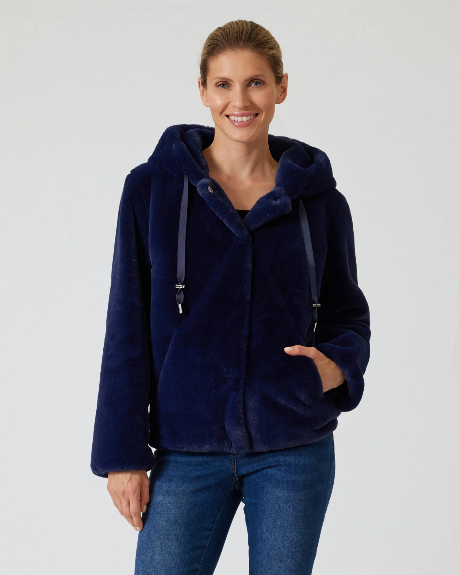 Kuschlig warm begleitet Sie die Jacke durch die kalten Tage: Das Fashion-Piece von Rita Pfeffinger kommt im jugendlich-flotten Design aus weichem Webpelz. Für den frischen Look sorgen die Kapuze mit Bändel und versteckte Druckknöpfe. In den Seitentaschen können Sie Ihre Hände wärmen. Erhältlich in Dunkelgrün oder Dunkelblau.