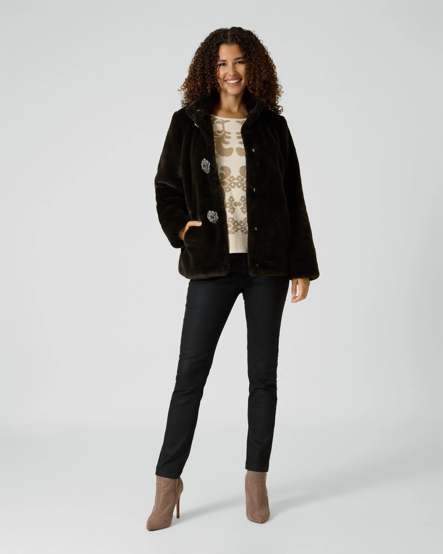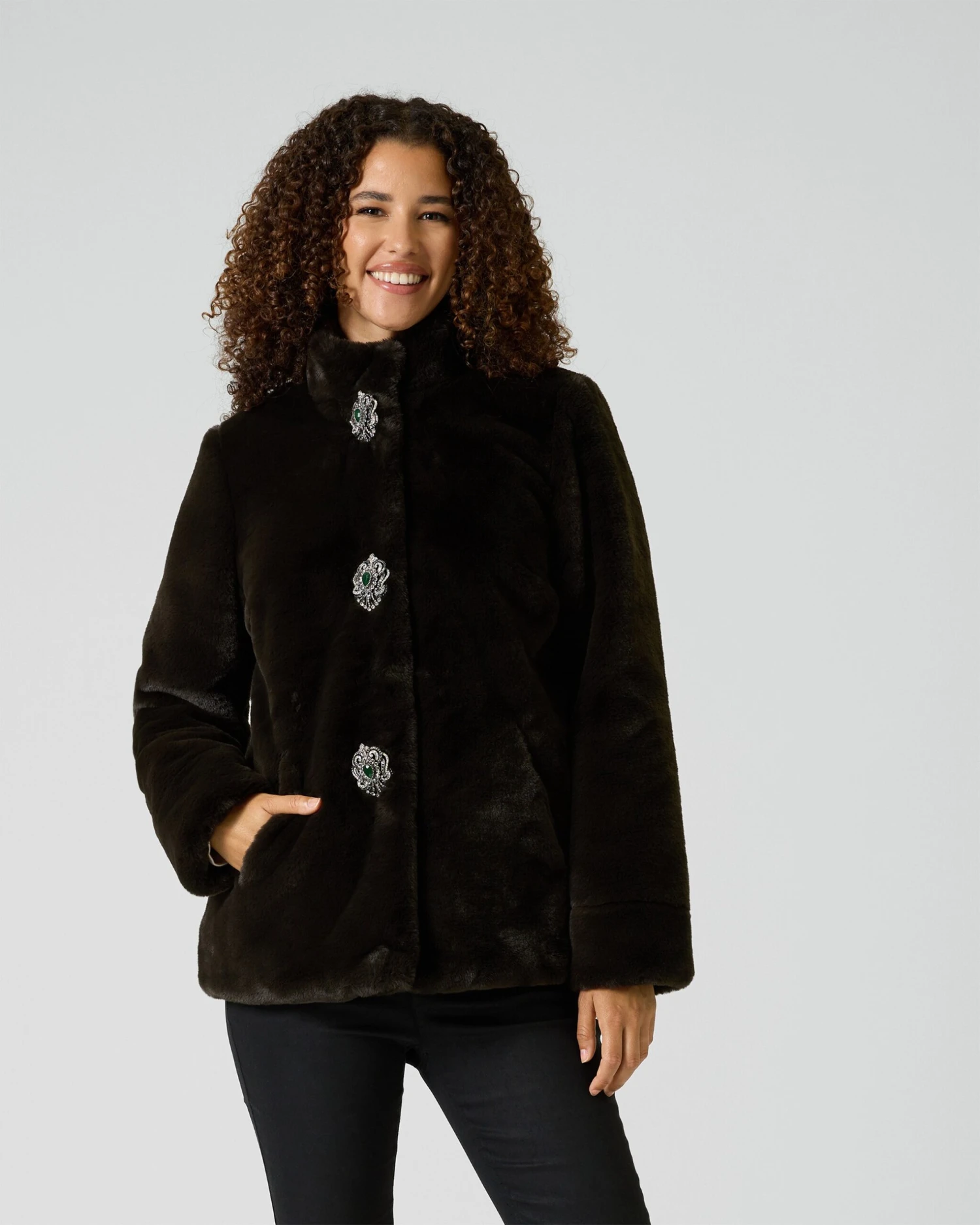 Alfredo Pauly wird für seine opulenten Styles geliebt. Ein wunderschönes Beispiel ist diese Jacke aus kuschlig-weichem Webpelz. Den trendaktuellen Look erhält das Fashion-Piece durch das Unidesign in Dunkelgrün und die drei großen, abnehmbaren Broschen oberhalb der verdeckten Druckknopfleiste. Der lässige Stehkragen und die überschnittenen Schultern machen die feminin-romantische Optik komplett.