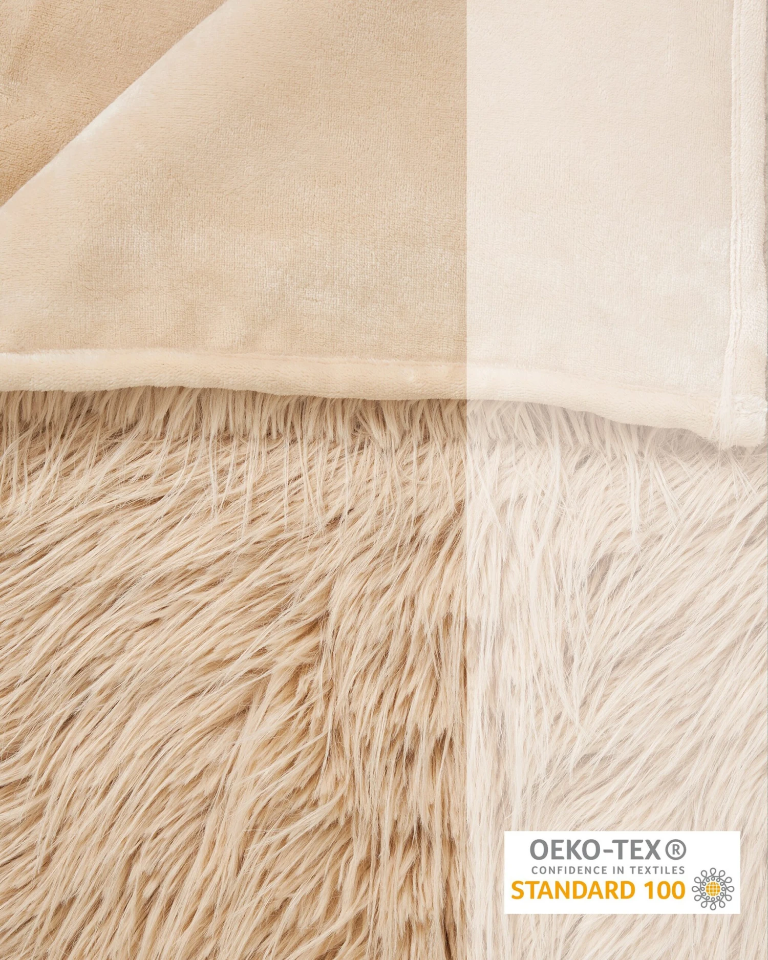 Mit dieser Wendedecke macht kuscheln auf dem Sofa gleich doppelt Spaß. Die Decke ist auf der einen Seite aus einem Fuchsfellimitat mit 4,5 cm Höhe, auf der anderen Seite besteht sie aus unifarbenem Cashma Plüsch. Ein besonders hübsches Home-Accessoire, das sich auch im Schlafzimmer als Tagedecke oder zusätzliche Bettdecke super macht. Für Ihr gutes Gefühl ist die Decke auf etwaige Schadstoffe geprüft und mit dem Öko-Tex-Label zertifiziert.