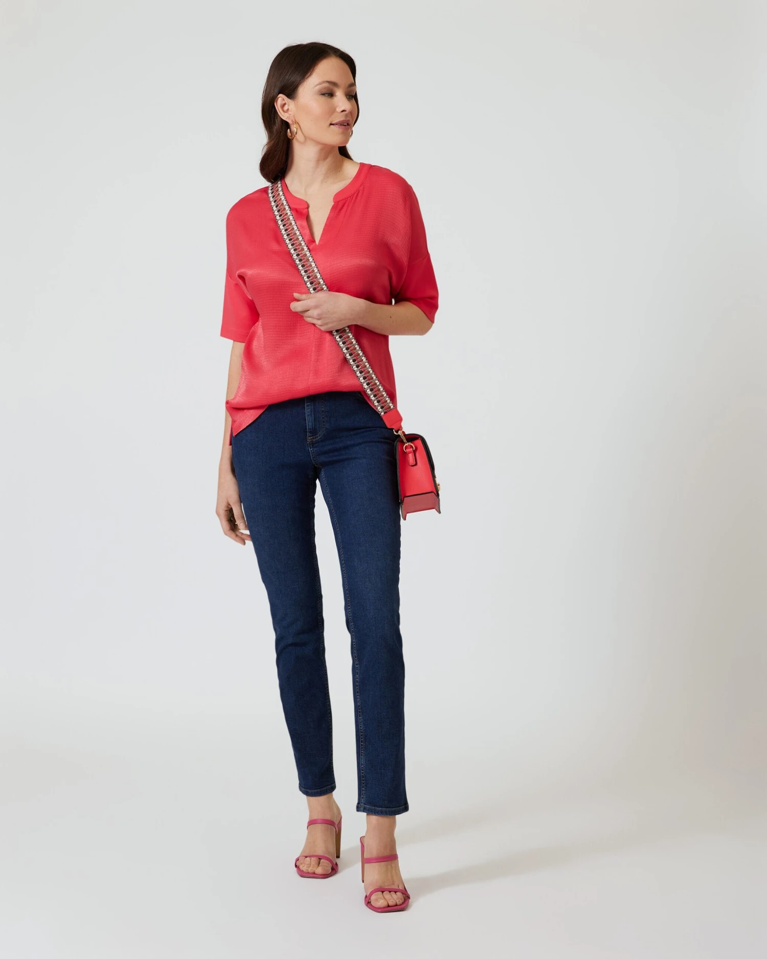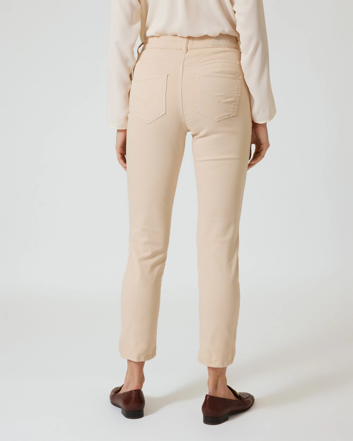 Die Jeans hat einen schmalen Schnitt, der nach unten hin enger wird und formt so schöne Beine. Die Gesäßtaschen zaubern einen knackigen Po und der Bund auf Nabelhöhe ist unheimlich angesagt.